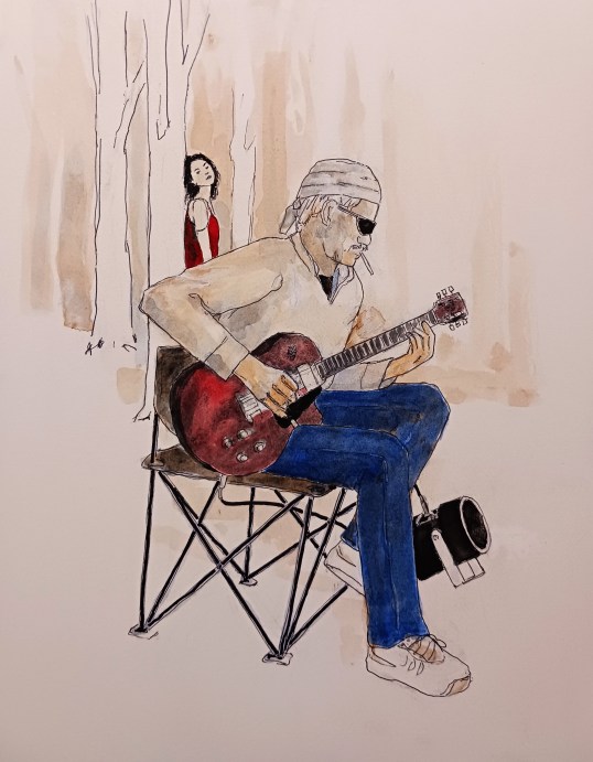 There was an extra camp chair but I didn’t sit down. No Invite. Finally, I reached into my pocket and dropped a dime bag at his feet. He hit that low D string and dragged it down from the tenth fret. “No pipe,” I said. “I do have Zig Zags.” He twisted the fingers on his chording hand to indicate start rolling. Then he scaled up to a C note and bent it up a note before dropping down to some open chord stuff.