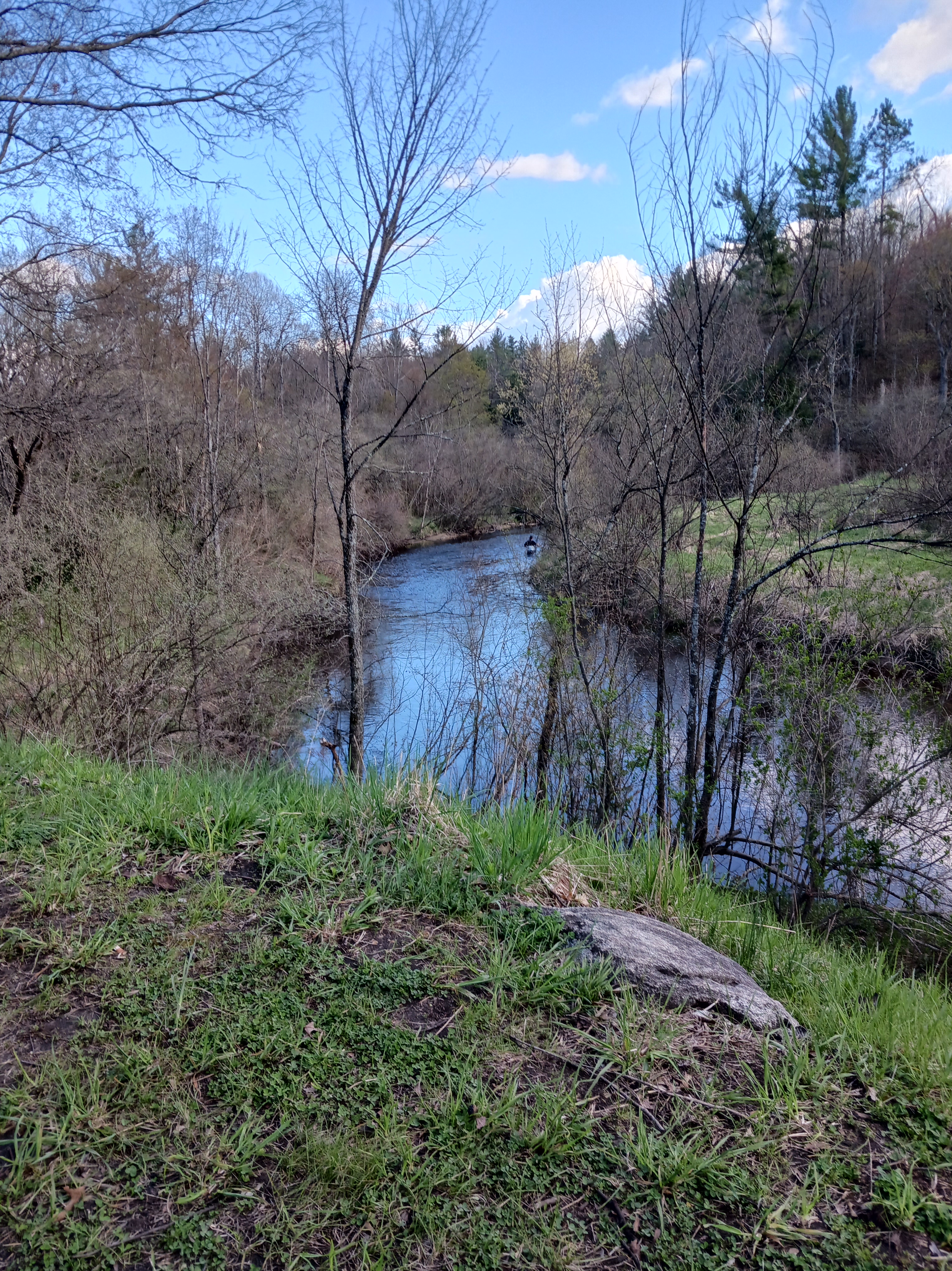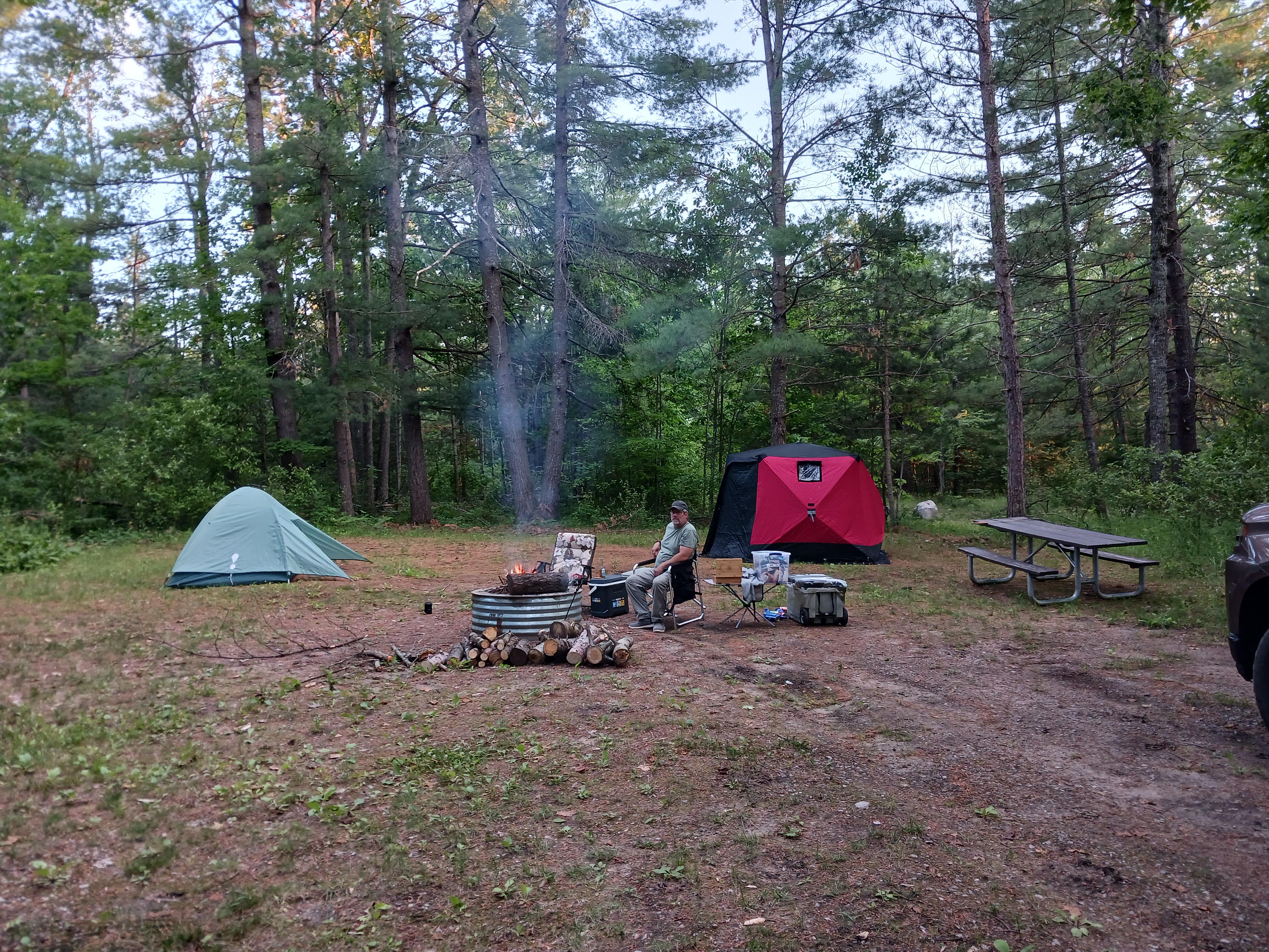 We didn’t camp in our regular spot on the Pine River. A young couple was camped there. I talked to the guy and offered him $40 if he would pack up and camp elsewhere and he seemed tempted but passed. The regular spot overlooks the river on a high bluff and has lots of room for trailers and tents. It’s first come first serve so that’s fine. No problem. Natch spent Thursday night in another spot, called me, and said it was too small. I drove to the spot and we decided we could make it work, and, turns out it worked well. We set a campfire and later found rocks and small boulders to build a fire pit.