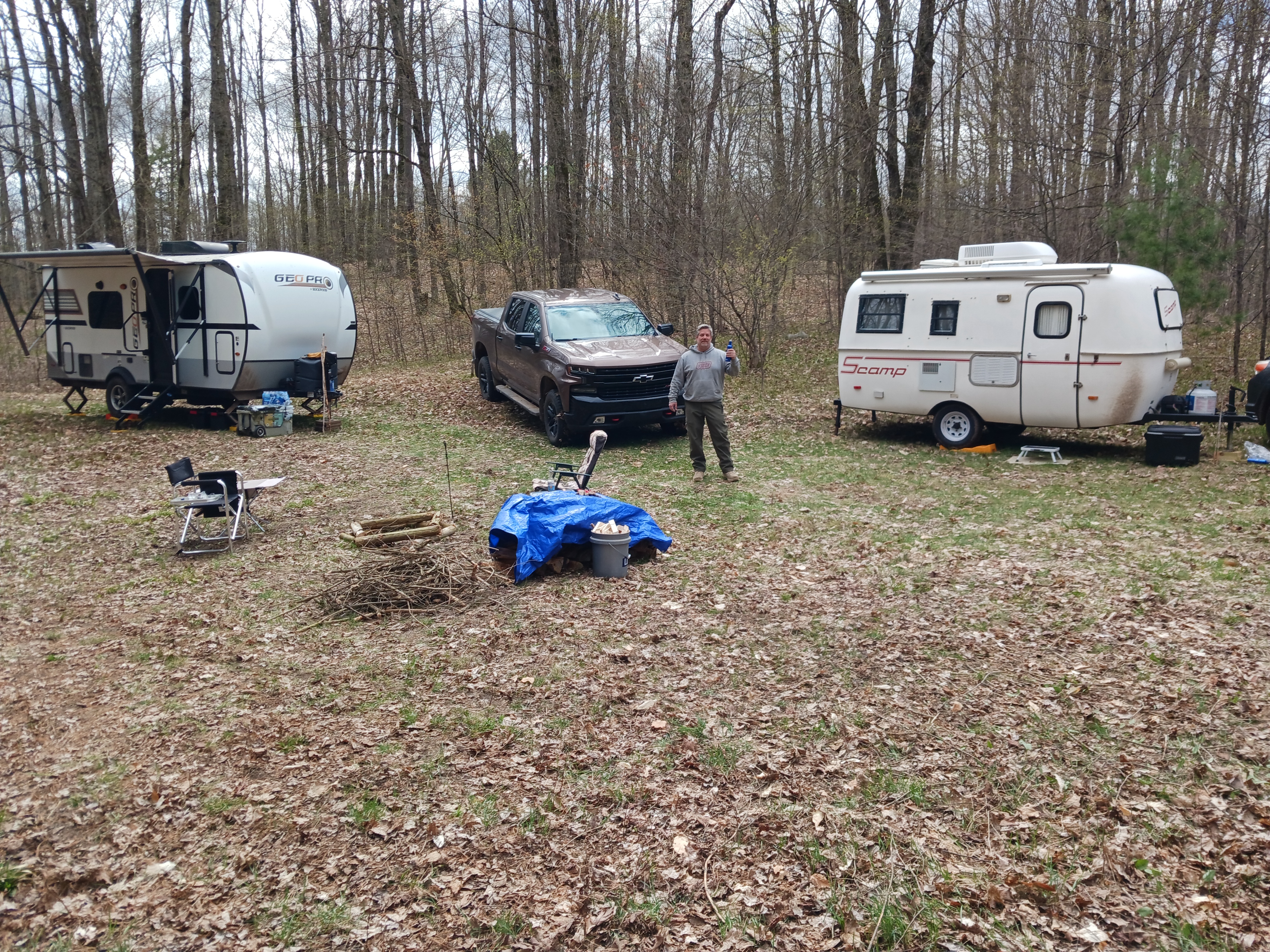 Feral and Jake arrived on Saturday. Feral had a new vehicle, a 94 Ford Ranger with something like 80k miles on it and no rust. He towed Jake’s 1961 Apache Chief tent camper. The two rode together. Natch and I lined up our trailers along one edge of the clearing to make sure there was room for the tent camper. The small clearing/hollow is surrounded by trees that act as a windbreak. We couldn’t see the river but it was an easy walk from camp. Bottom line: This is a great camp option in the future.