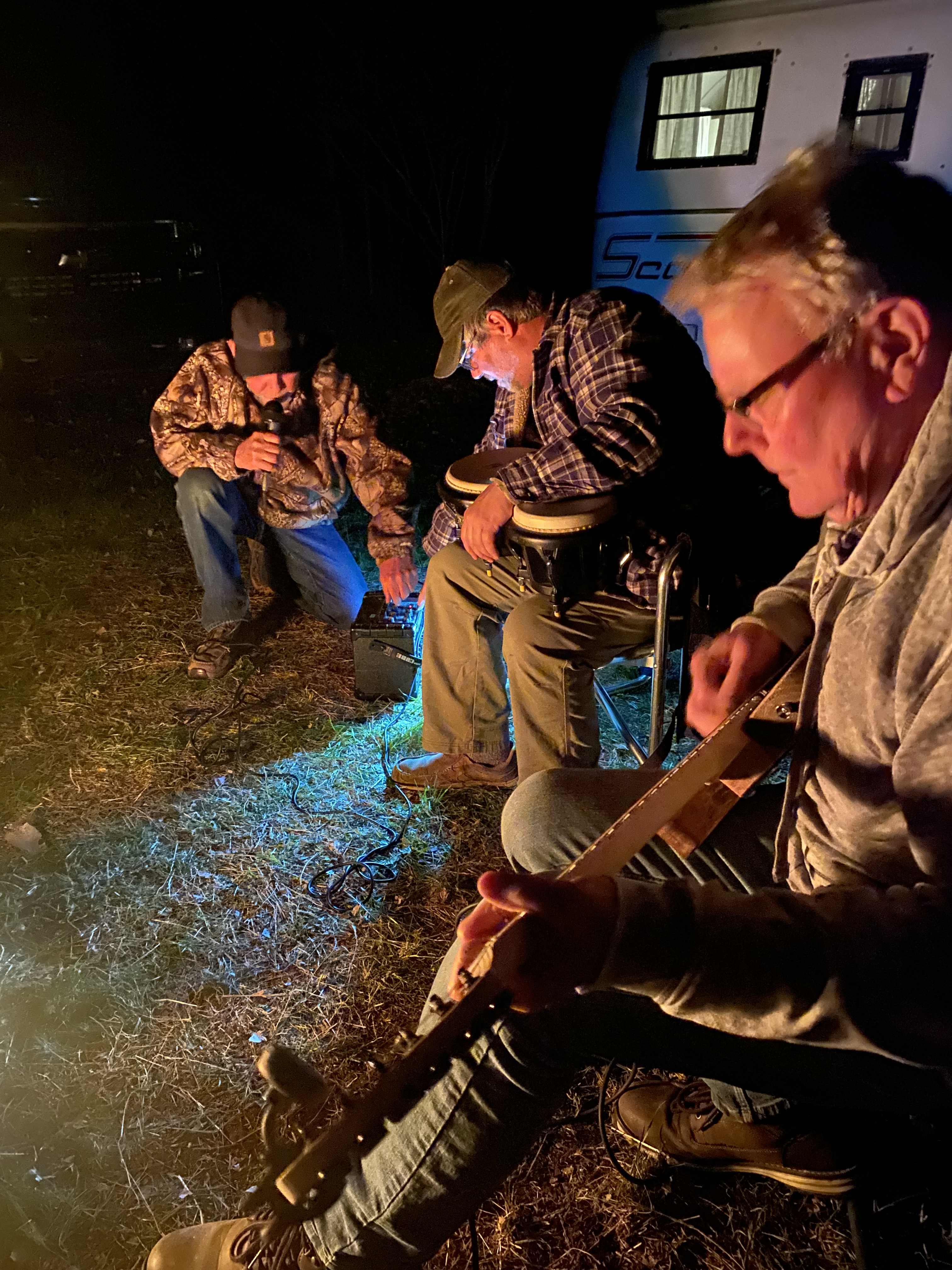 Natch found the first mushroom. That’s me, Luther, with my walking stick. We didn’t do as much fishing as usual – mainly because our regular spot (that was taken) has good fishing right over the hill. Also, the river was flooded when we arrived. By Sunday it was coffee-colored and wadable. Natch did a stretch and caught five keepers which he released. Jake and Feral did a stretch together and brought back two to take home. I did another stretch and caught one and missed a few others. So the fishing was good. We talked about tossing worms into a big hole below 6-Mile Bridge on Monday night but we were still in recovery mode after the late-night Sunday jam session. We packed up on Tuesday morning and vowed to figure out some more trips this summer.