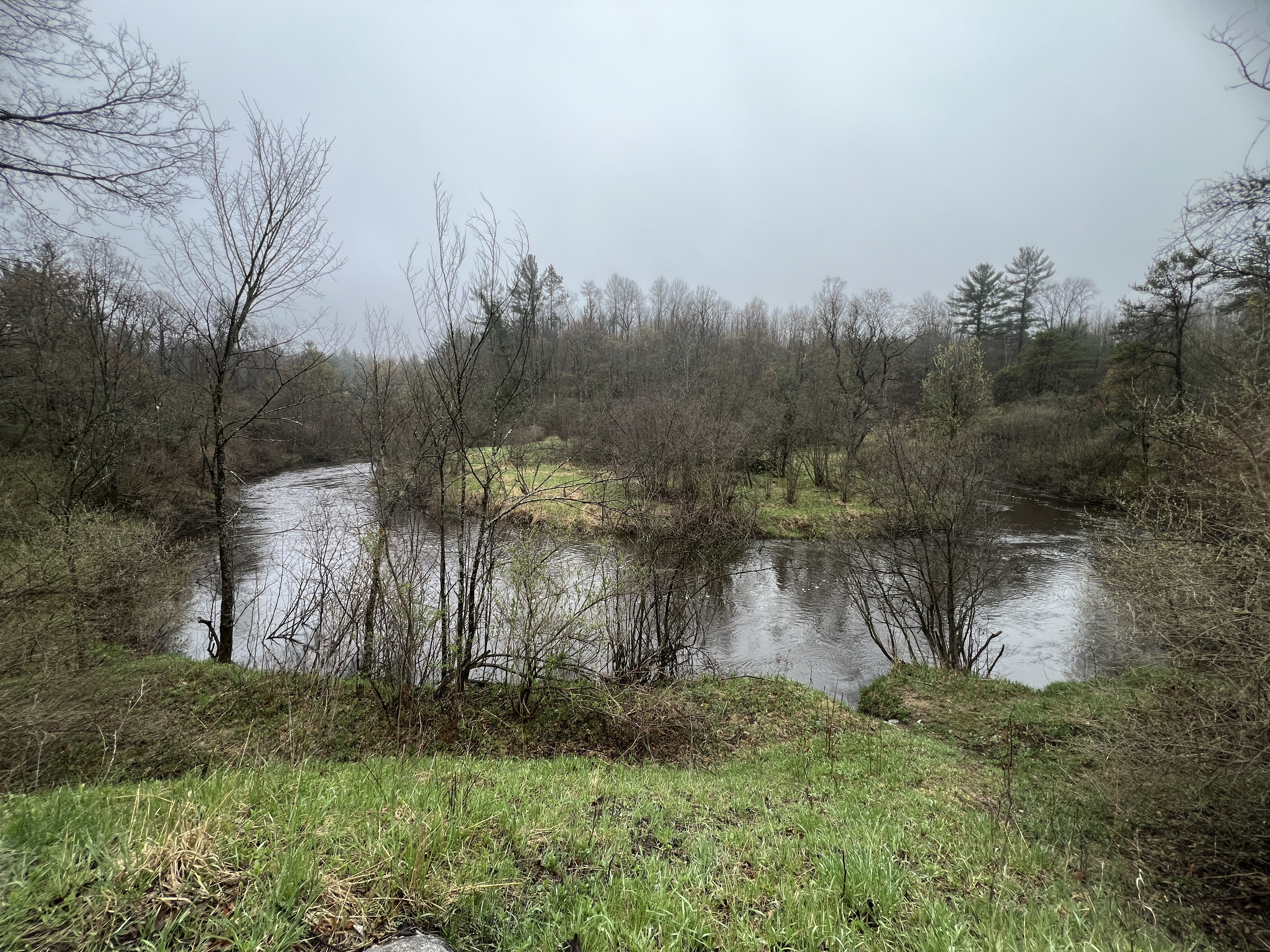 We usually fish the Sturgeon and the Pigeon. The Sturgeon was high and stained, the Pigeon low and clear. That didn’t make much sense. We grabbed some breakfast in Gaylord, food at Meijers, and then fished the “valley” on the Sturgeon. It was tricky wading. The water was just deep enough to hide logs and boulders so it was lead with one foot, bring the other foot up. It was deep enough to where trout hugging the bottom may or may not see a lure pass by overhead. Still, we caught a few. Nothing to brag about. And we saw enough fish to keep it interesting. We had a sandwich back at camp, checked out the lake, gathered firewood, and finally decided to head over to the gravel pits, another spot on the Sturgeon. Same thing – high water and stained. Natch caught a brook trout on his first cast. Then another out of the same bend.