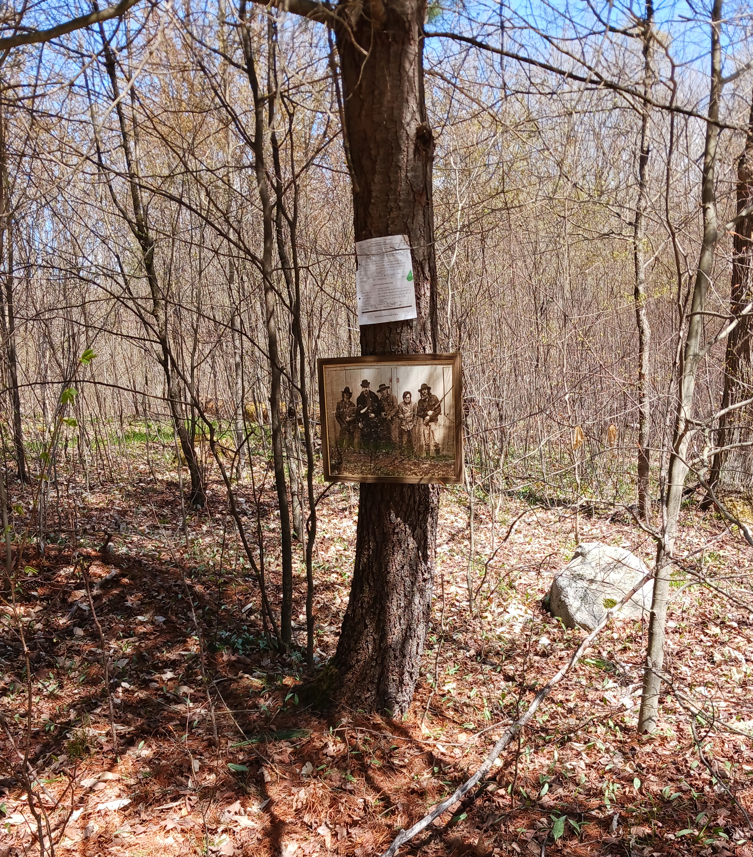We always remote camp (dispersed camping) on state land with a form you post on a tree for anyone to see, including the Michigan DNR. It’s free to do this but there are rules to follow including what distance you must camp from a trout stream. I had brought along a framed photo of the Phillips Gang for Jake. I hung it up just below the camp tag. I thought he and Feral would get a kick out of seeing it there. The photo shows what appears to be an early 1900s photo of an outlaw gang, which in my mind was like a warning to people to turn around before pulling into our camp. A ridiculous idea if you know the guys I camp with. They are all friendly and laid back. The photo includes Feral, my step-dad Ken Phillips, myself, an old friend, Don, from high school, and Denny, a trout camp regular. If you type “Phillips Gang” in the blog search tool you’ll find a better photo.