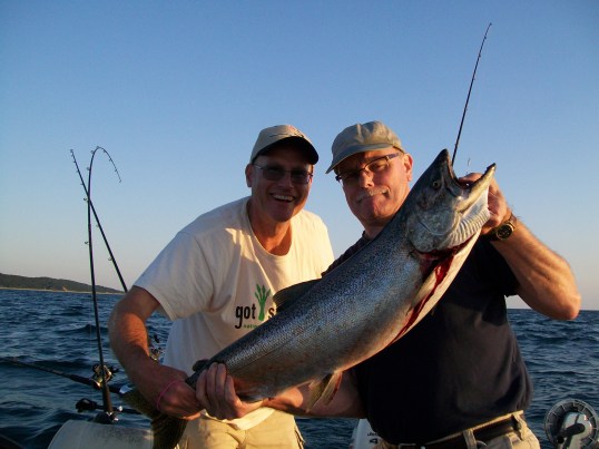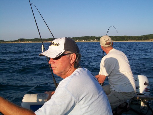Lake Michigan was choppy and I couldn’t help but wonder if it would get worse.  The sun was dropping to the horizon and I could see Little Sable Point Light House in the distance. While I was taking it all in, we had the first strike. Larry grabbed the pole and handed it to me. I have done a lot of fishing so I’m no stranger to the drill, but Salmon on Lake Michigan is another animal.  (I normally fish inland lakes and small trout streams.) It felt like a motorized anchor on the end of the line – I reeled line in, it pulled line out.  I finally got it up to the boat and Larry netted it. A King Salmon with a glittering body that would make my wife’s polished silver look tarnished. A spectacular fish.  My first impression: 30 lbs. Larry’s impression: 18 lbs. I guess I go with Larry’s impression.
