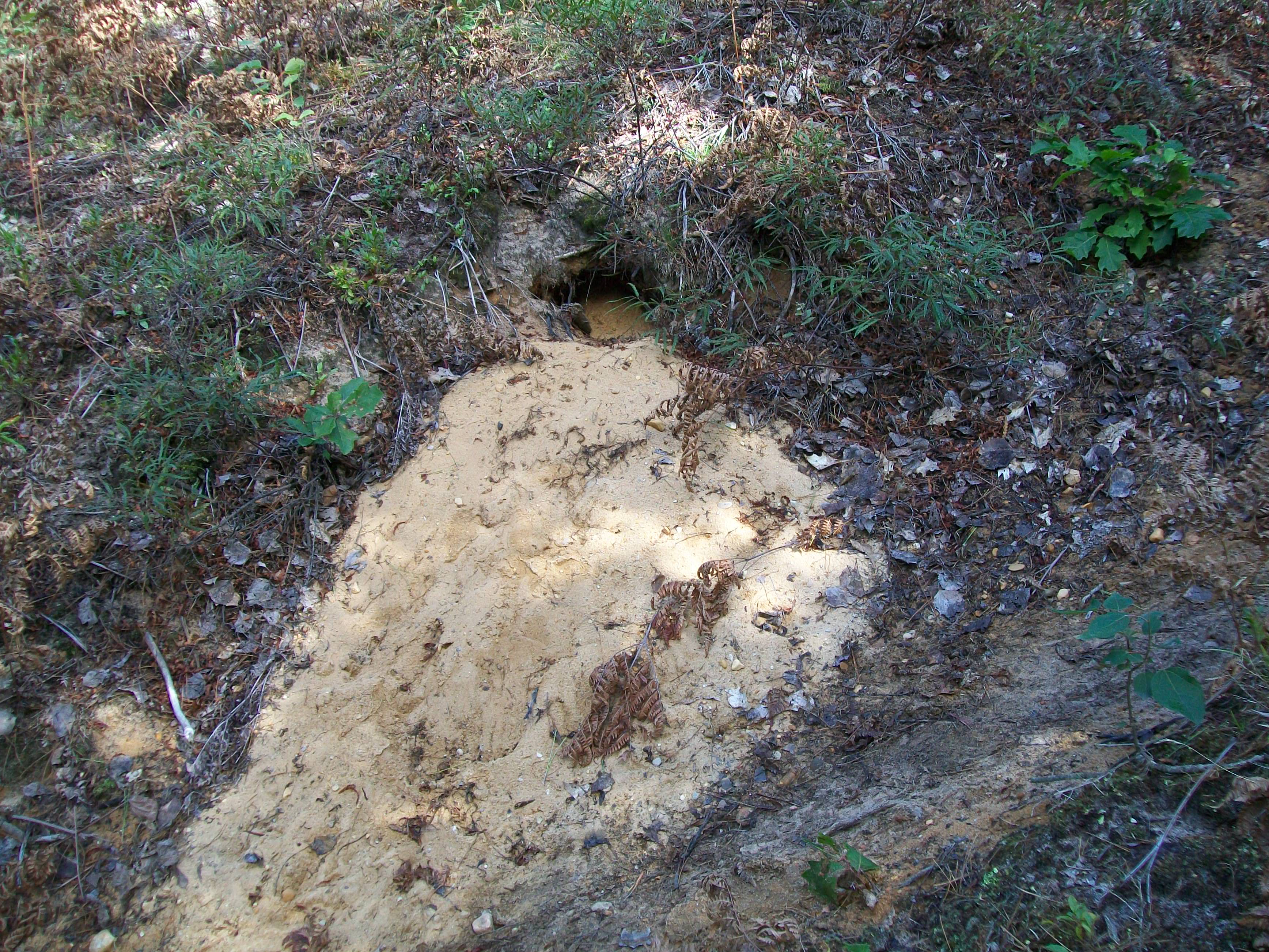On Saturday morning Natch and I headed over to the valley to fish the Sturgeon. I headed up to the horse bridge and he headed down the big hill by the Ford property. I heard a shout and next thing I saw was him running back up the hill. He had come face to face with a badger loping up the path. We went back down to check it out and found the badger den right on the foot path.