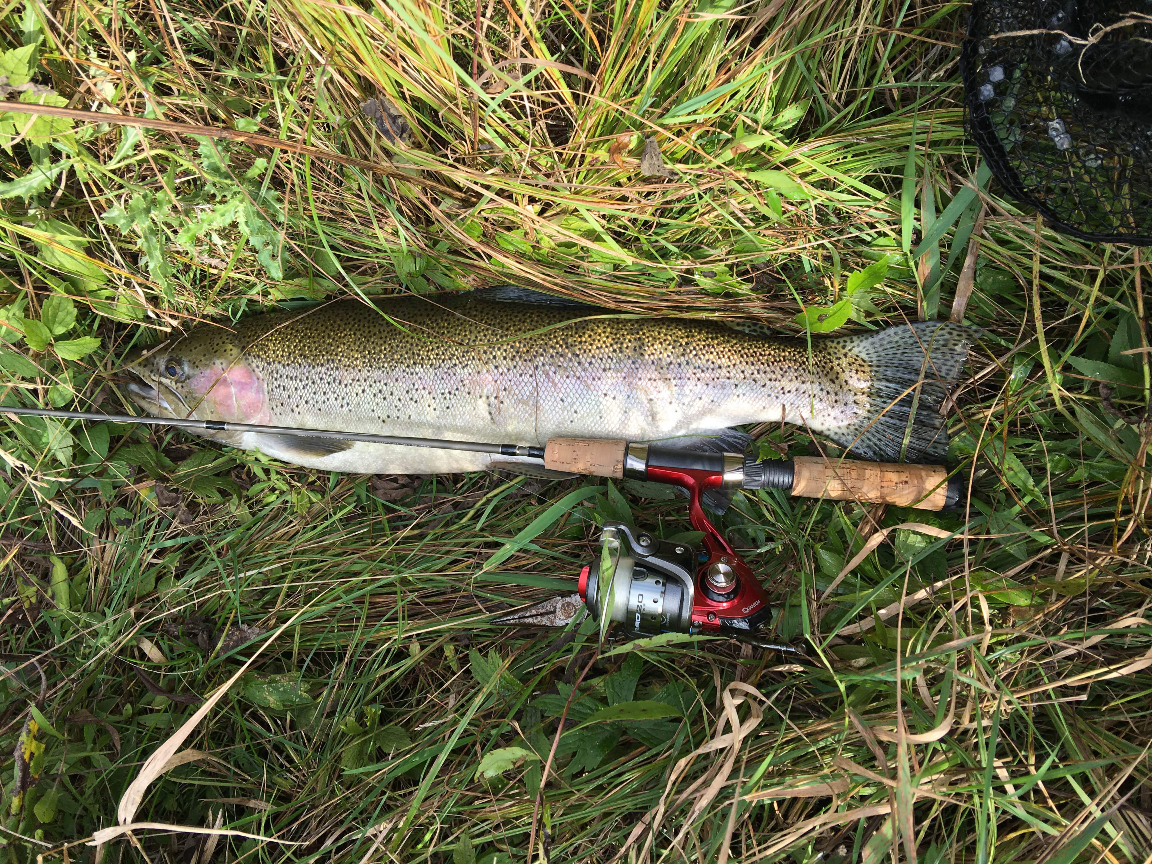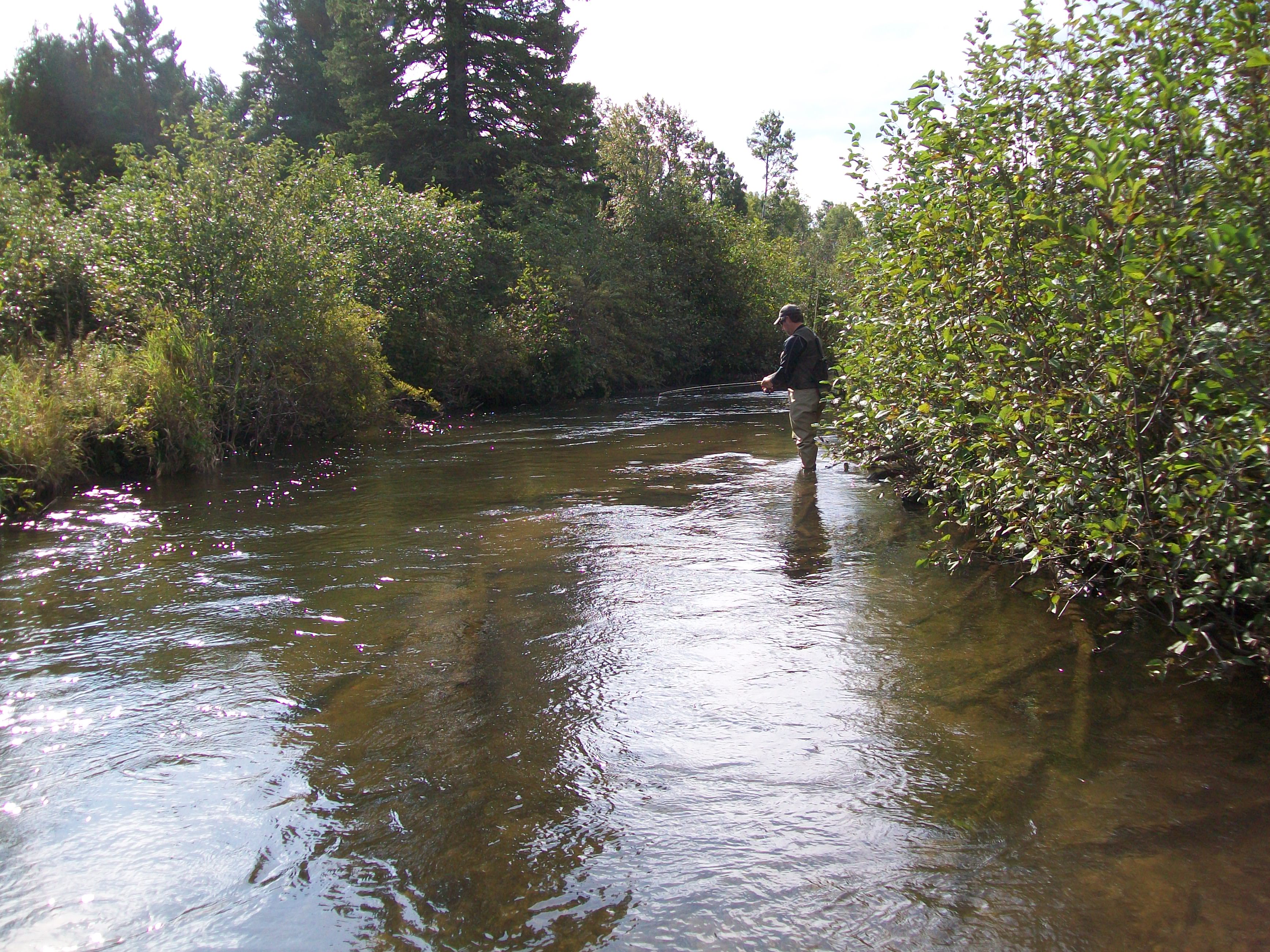 I met Feral, Natch, and special guest Chopper up at Pickerel Lake for the trout season closer and on the way up it threatened rain. I would have been happy to set up in a downpour if it would have muddied the rivers. No such luck but the clear steams did give up a few keepers and one lunker. Feral and I did a stretch on the Sturgeon late Friday afternoon and he popped several keepers while I nailed sunken logs. I finally realized I didn’t have my polaroids. Pretty critical error. Helps to see into the water!