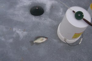 It actually started well, one of the other guys pulled out a crappie right away, within seconds of dropping a line. Great, right? Feral and I set out a few tip-ups for pike (one fish equals a whole meal!) and then started working on finding crappies, bouncing from hole to hole. I caught one decent crappie, 9 inches, and Chuck caught another. Not much shouting from the other guys but they were toughing it out. Tiny perch were biting, trending smaller as the hours went by, whereby the smallest perch might have brought some honor if we would have pre-thought having a smallest fish contest.