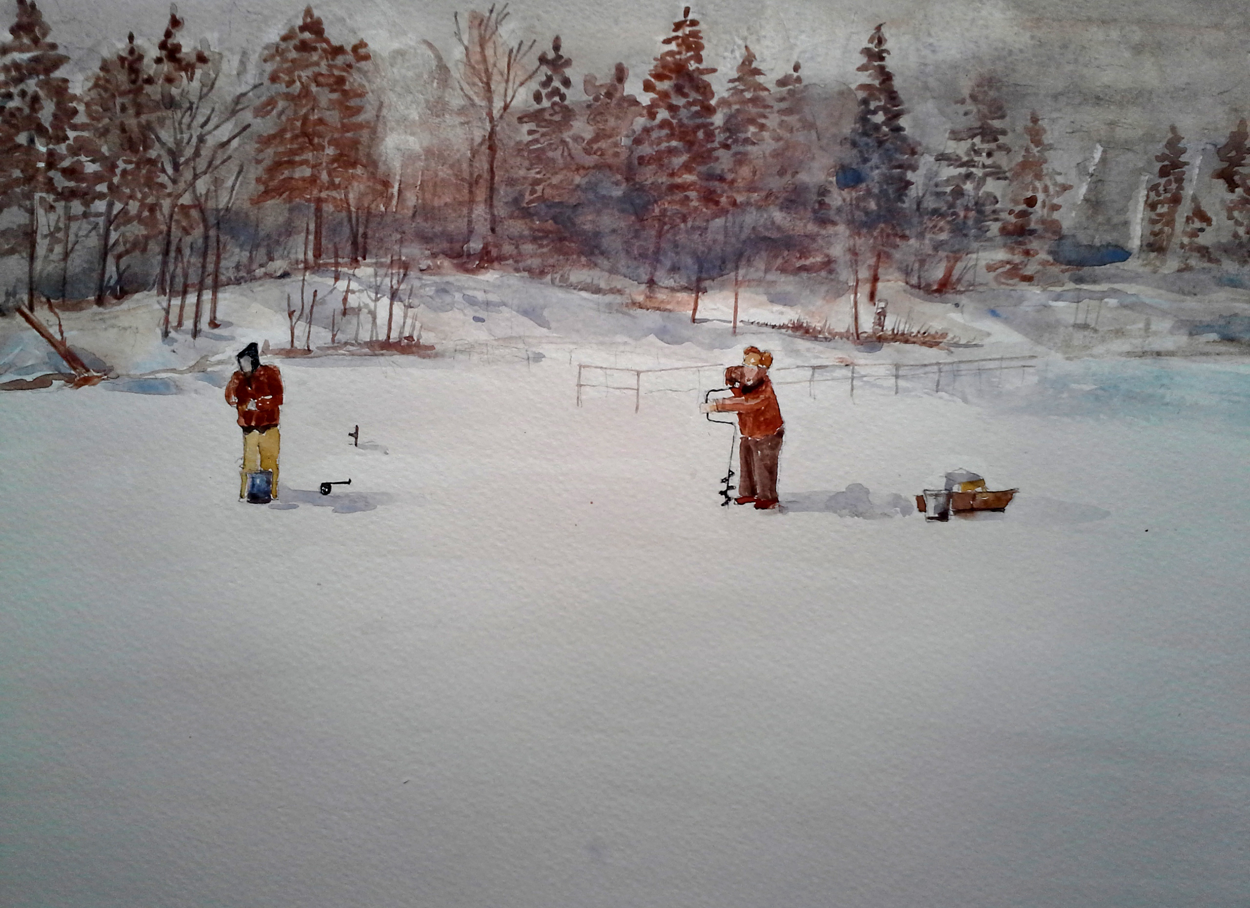 Feral, Chuck and I had all found the same internet post about where to fish. Four hundred yards out from the boat landing, veer right. As it happens, two other ice fishermen headed out on the ice minutes ahead of us and it appeared they read the same post. Hess Lake is 755 acres, huge, so if these guys turned around, it probably seemed like we were following them. We ended up on the same acre, OK, 1/4 acre, but they were cool about it, even talkative, which is always a good thing.