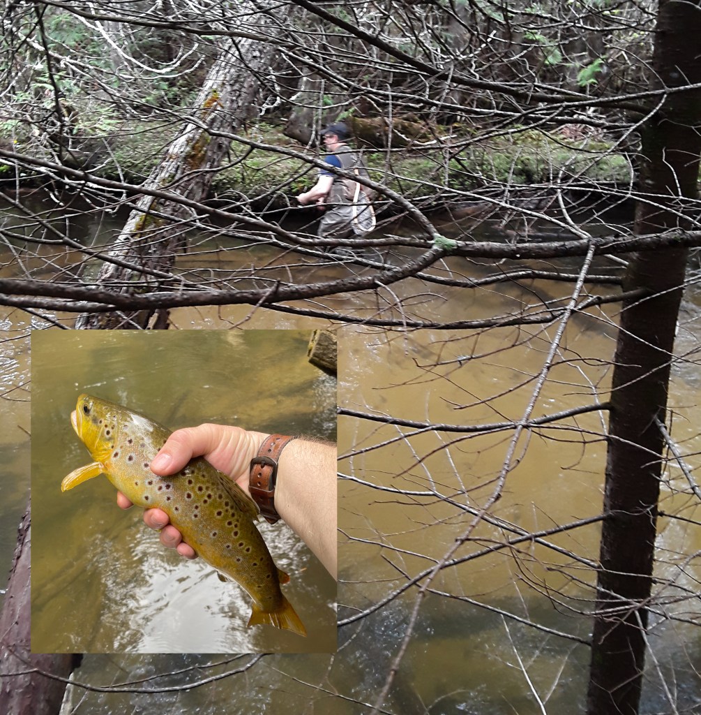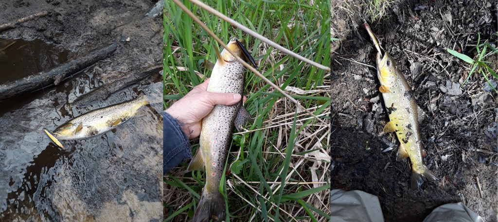 We saw and caught fish but it required some short pin-point casting. You couldn’t wade for more that ten steps before getting out to go around trees. The fish were hungry but we had to drop the lure right in front of them and hope they would catch it within the short space of winding back. The water was clear increasing the chance the fish would spot us and hide. Here’s one Natch caught. Very obviously a brown trout with the spots if you are not sure of your trout species.