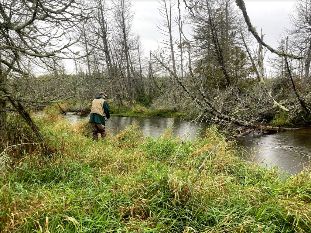 A cold closer once meant large brown trout have headed upstream from lakes to spawn but something’s wrong. The big fish have been missing the last few years in the Sturgeon and the Pigeon. (We have been fishing the Pigeon a couple miles down from the yoga camp where there’s less silt damage.) The culprit is most likely global warming which may push the spawn into November. No telling how that will play out as far as sustainability. No one saw a trout in the twenty inch range. That is quite a change from just a few years ago.
