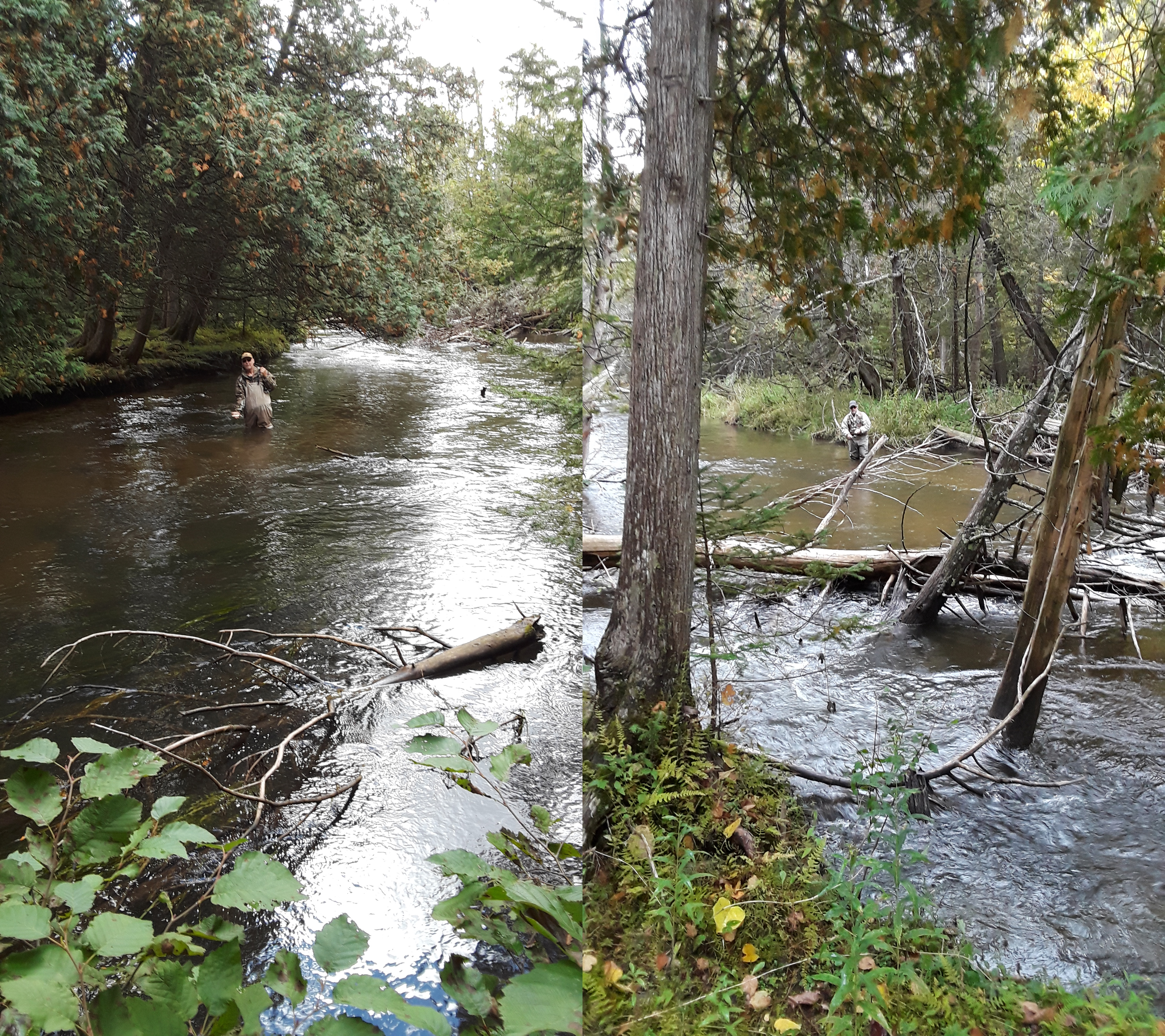 A cold closer once meant large brown trout have headed upstream from lakes to spawn but something’s wrong. The big fish have been missing the last few years in the Sturgeon and the Pigeon. (We have been fishing the Pigeon a couple miles down from the yoga camp where there’s less silt damage.) The culprit is most likely global warming which may push the spawn into November. No telling how that will play out as far as sustainability. No one saw a trout in the twenty inch range. That is quite a change from just a few years ago.