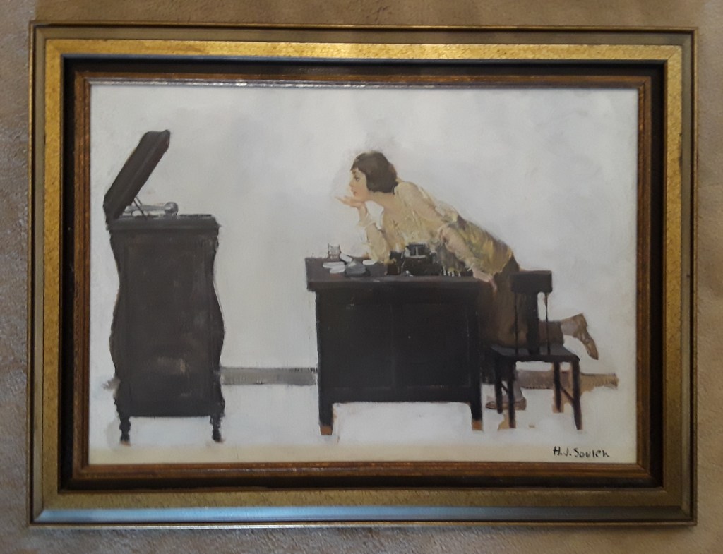 I am still trying to find out where the oil painting, Girl with Victrola, was published, along with a second illustration Henry did for that project, which I was fortunate to acquire from the Soulen estate. The estate added two studies Henry did for the second illustration, one of the man, a line drawing, and one of the girl done in watercolor. Here’s the watercolor which is spectacular on it’s own.