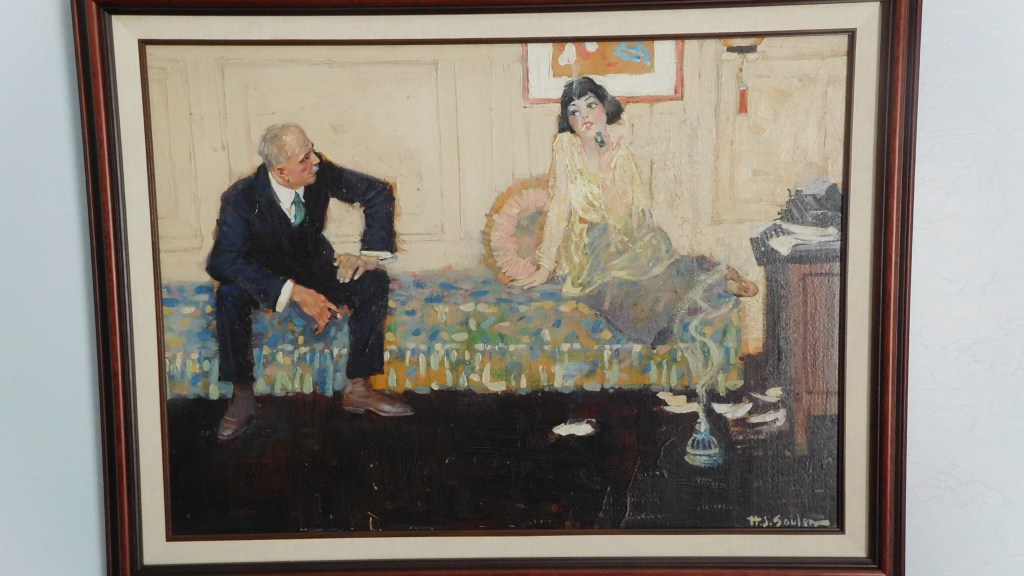 I purchased the above magazine illustration done in the 1920’s by Henry Soulen, a “Golden Age” illustrator about two years ago at an estate sale. The illustration was done in oil and I was concerned about the frame which had glass pressed against the oil paint. I took it to a local gallery, Lafontsee Gallery, to have the glass removed. I browsed the gallery while the owner took the artwork to the fame shop in the basement. She came back upstairs smiling and said I was not going to believe what was on the back side of the painting. (It was covered/hidden by brown paper, standard framing practice.) She turned the art board over and showed me this.