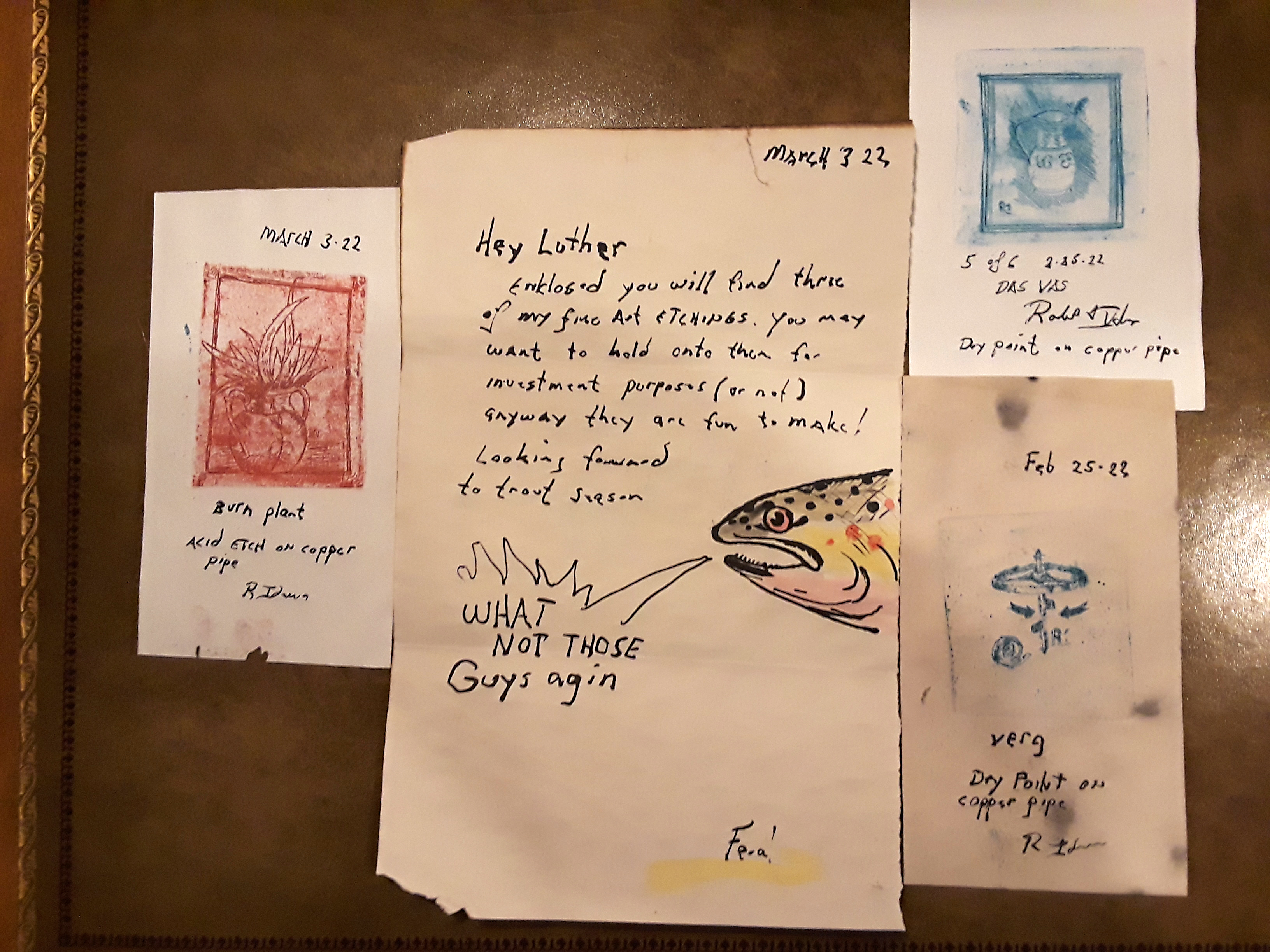 The above letter from Feral Tweed was a nice surprise and reminder I am not alone thinking about the upcoming trout season. We talked on the phone a while back and he mentioned doing small etchings and experimenting with materials. Seemed like a nice diversion to stay busy during a bitter cold Michigan winter.