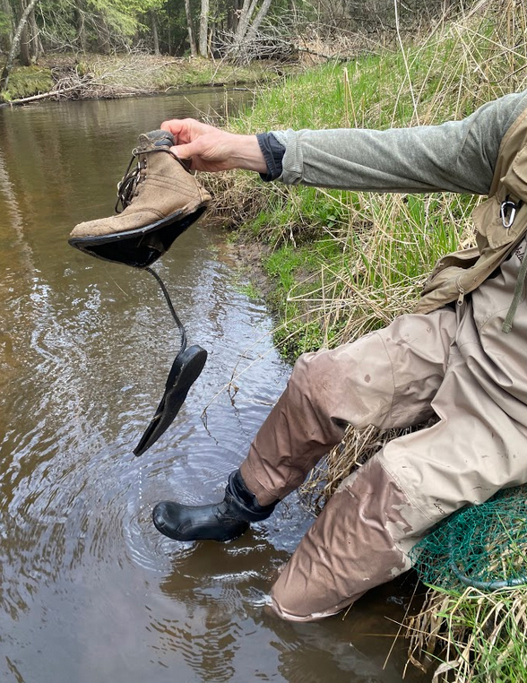 I moved up to get a picture and had massive wading boot failure which cut our fishing short. We ran into Big Rapids looking for wading boots and found none at the Dunham’s store so we tried Wal-Mart. They had no wading boots but did have a pair of black work boots for $25 so I bought those a size large and they worked great! I am tempted to try to find some regular felt-bottom wading boots because they provide excellent traction, even on clay shelves, but may stick with these. Can’t beat the price.