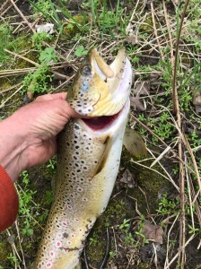 Feral was heading home on Monday so late Sunday afternoon he fished the stretch below camp. He was determined to catch the largest trout. He was gone a long time, enough for me to get a little concerned. I called him to see how it was going and he had just landed a 22 inch brown trout. He took a photo and sent a text message, then released the fish.
