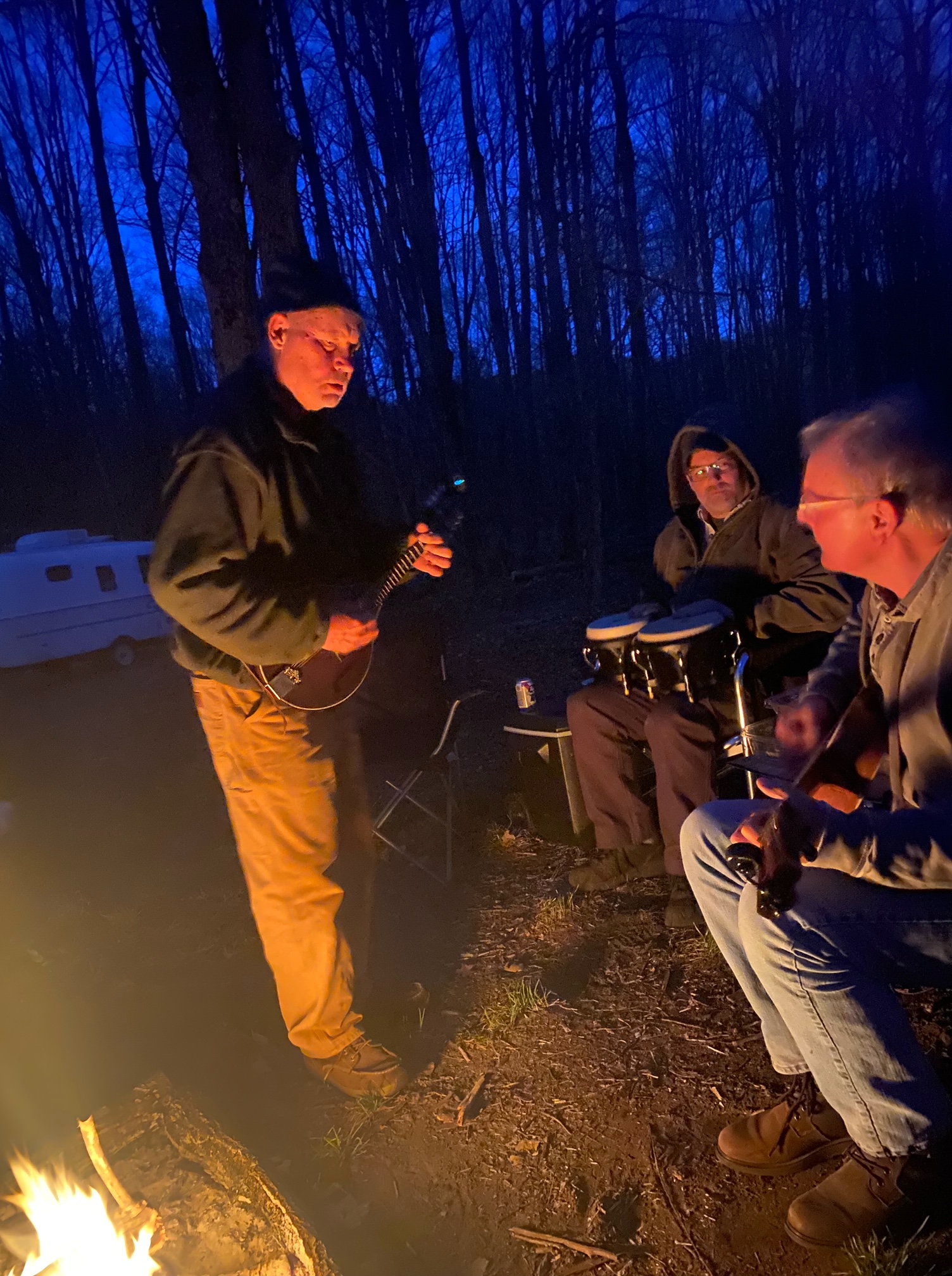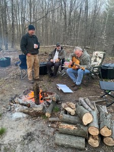 Feral showed up with Jake and we had an excellent jam session around the campfire. Jake brought a vintage guitar, an off brand that was made by Martin in the nineteen thirties. Bob had my mandolin and Natch had bongos and a tambourine. I had my Ventura camp guitar. I re-wrote a classic Lightfoot song. “The Wreck of a Jeep that was Feral’s. The gist of the song was Feral nursing a dying Jeep to trout camp. It went quite well considering everyone there, save me, are Jeep lovers. Also tried some new songs, Losing my Religion and Kryptonite. Another roaring fire: special thanks to Natch who brought a battery powered electric chain saw. Best invention ever. We played into the night.