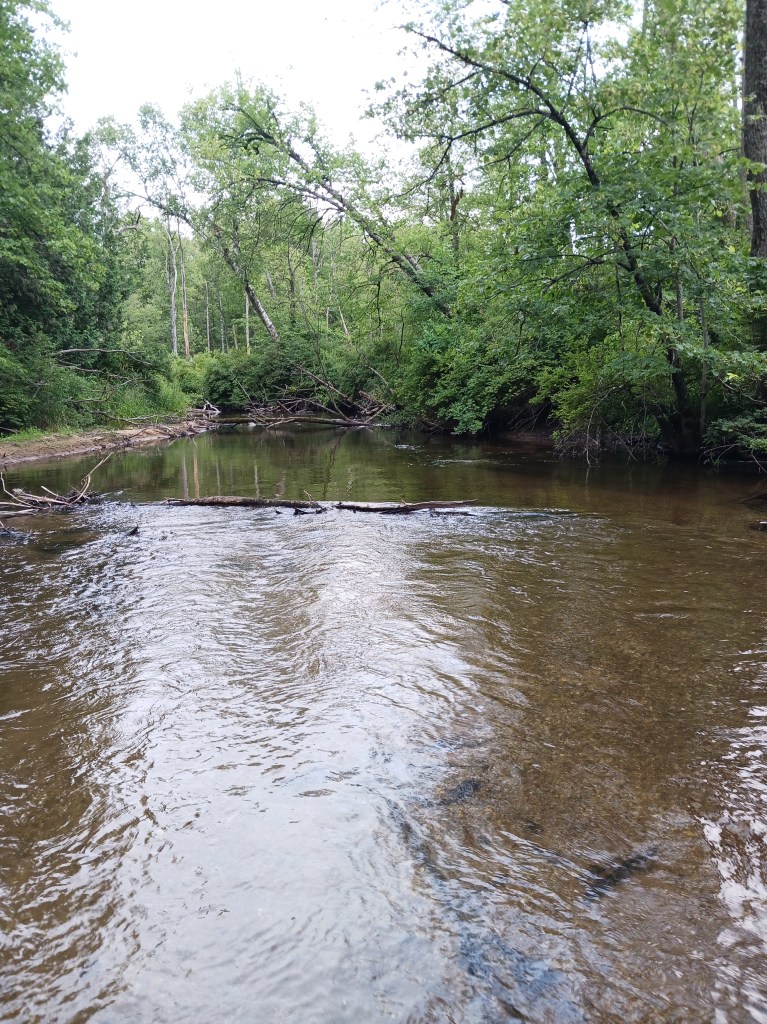 I drove up to the Little South Branch of the Pere Marquette River this week after watching a weather report saying there would be an all night rain. When I arrived there was no evidence of rain. It is a good hour and a half drive so I made the most of it. It was frustrating because I saw trout and had two hit the lure but no solid hook-up. I fished for an hour and a half before calling it quits and driving up to the Pine River, another half hour, hoping that it might have rained further north.