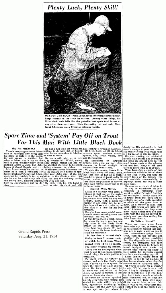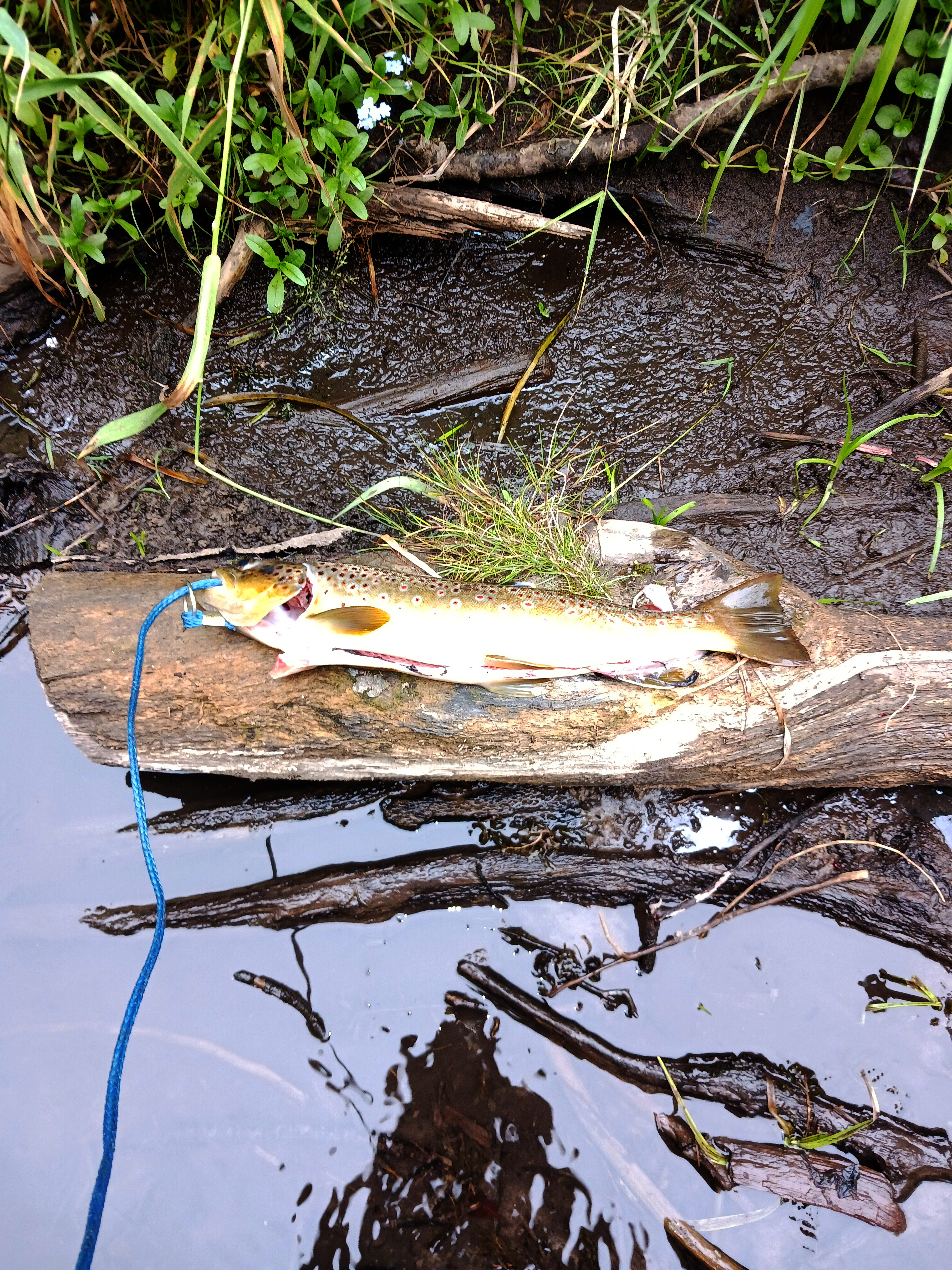 There are lots of stretches on the Pine to choose from. (No sign of rain.) I decided on a stretch that is easy to wade and easy to get back to the car. My back was sore from wading the Little South (and too little exercise) and I was hoping to make short work of finding dinner. I didn’t see trout in some of the best initial holes and found myself looking into a narrow opening in some overhanging branches. An extremely difficult cast up to the shadowed river edge. I had put new line on my reel and felt confident about my casting so I made an underhand flip cast which landed exactly where I hoped. Half way back I couldn’t see the lure but saw a very nice brown trout porpoise as it looked for the lure. He didn’t take it so I waited a few minutes to make the same, exact pinpoint cast. The pressure was on. You might compare it to making a very difficult, long putt twice in a row. Or hitting the bulls-eye twice in a row with a re-curve bow at fifty yards. You get the idea, don’t flinch under pressure. This is the trout dinner. So I made the cast and the lure went up under the branches and landed within inches of the first cast. This time the trout was there and ready. It was hooked good. I field dressed it and put it on the stringer. I fished another bend and called it quits. I had dinner. I felt like I had earned it.