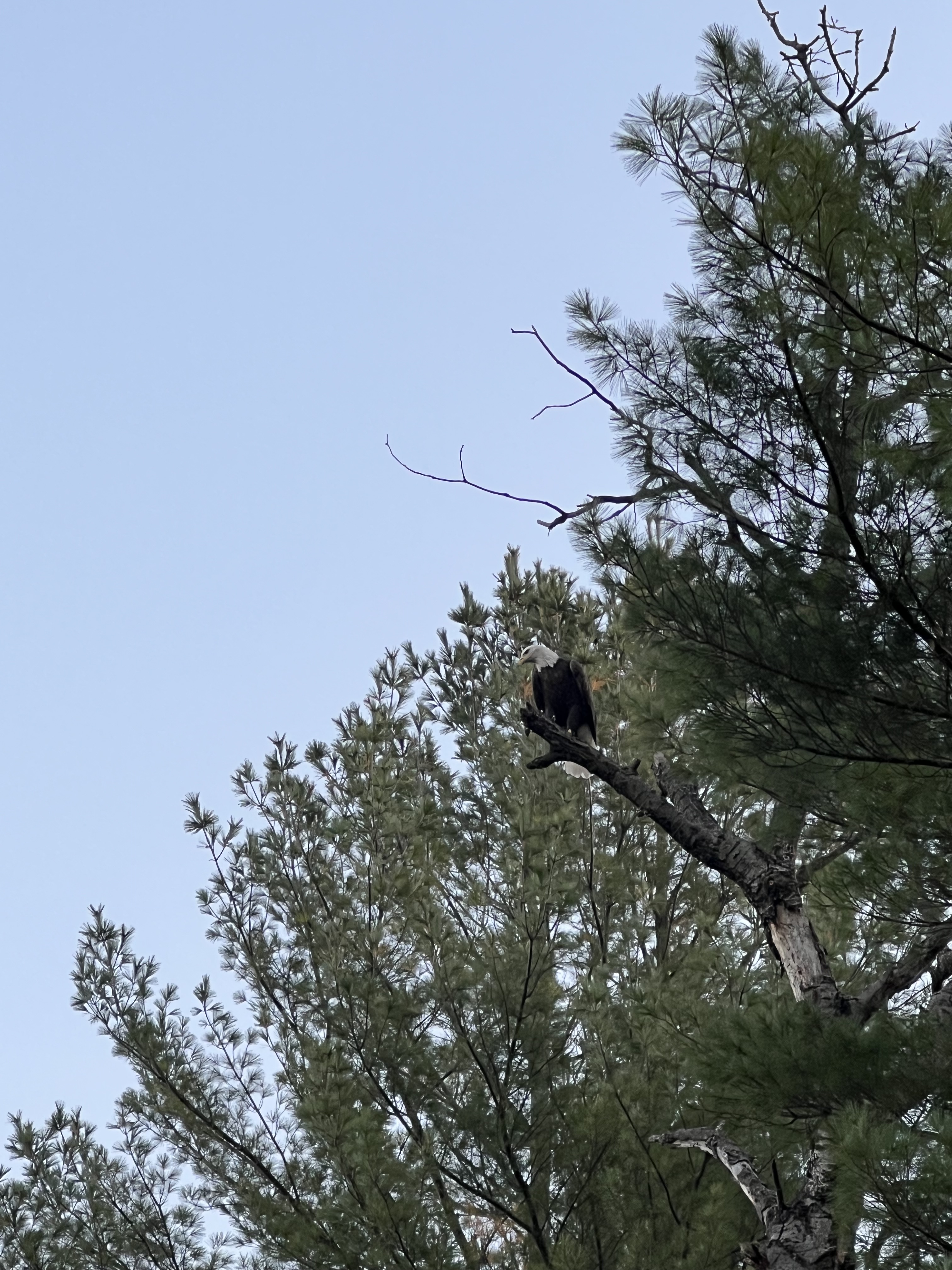Saturday morning Natch and I went into Vanderbilt for some breakfast. On the way we spotted a bald eagle and took some photos. I stopped the car and we got out. It crossed the road, tree to tree, and didn’t seemed concerned about us. Natch took this photo.
