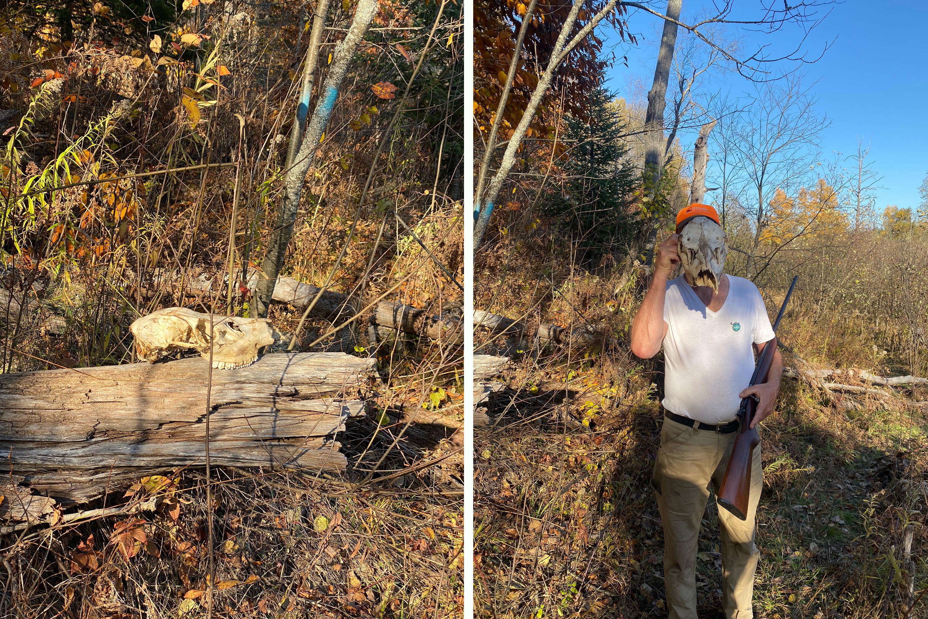 When Natch and I fished the Cornwall stretch Natch found an elk skull and placed it on a log next to the foot trail. Feral and Jake took the foot trail hunting, found it, and stopped for a photo.