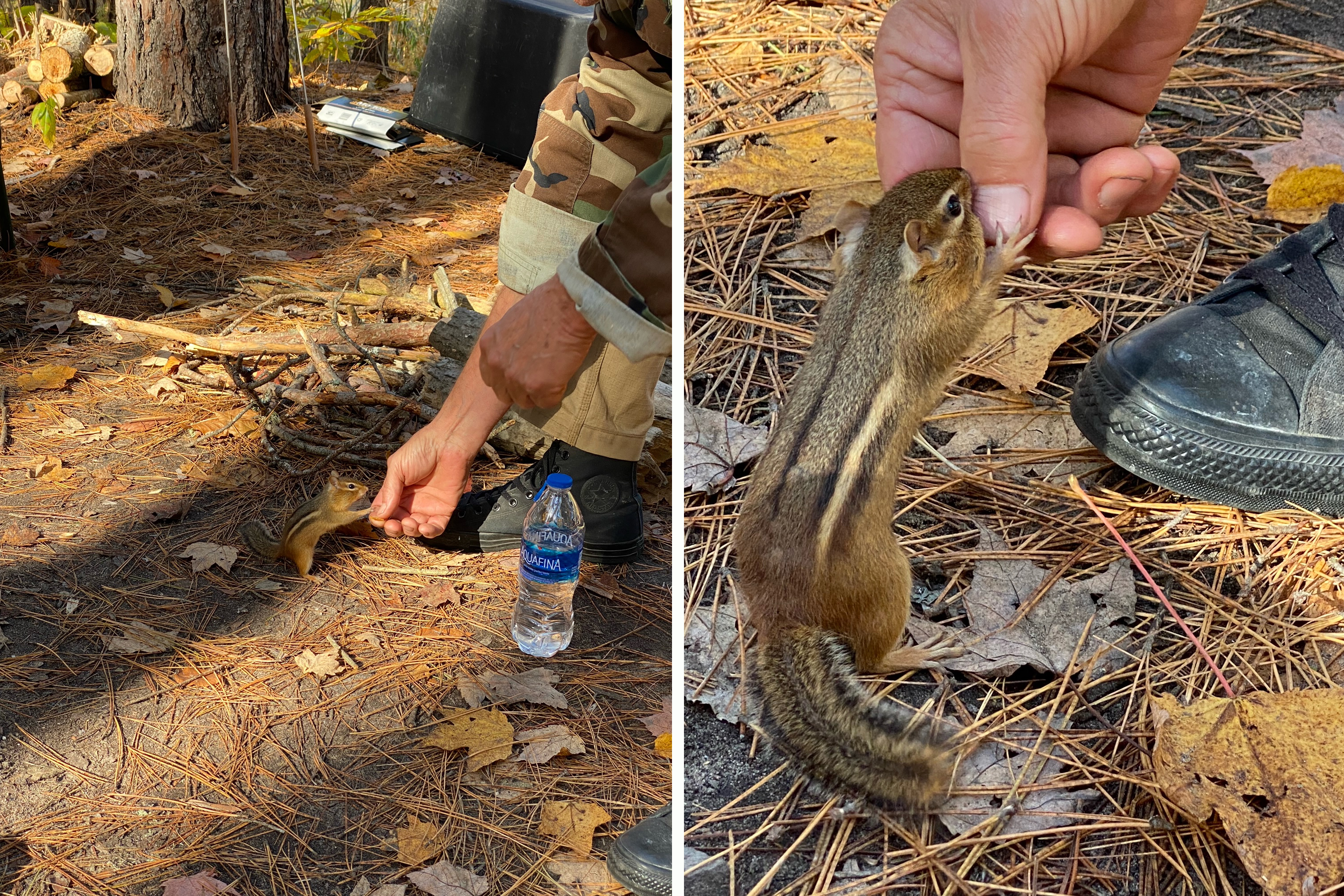Back at camp we had a visitor. A tame chipmunk. Feral and Natch hand fed it crackers. It was completely unafraid of people. Feral kept feeding it smaller and smaller pieces and at one point it decided Feral’s finger might be food and clamped down on that. It let go but surprised Feral, no damage done.