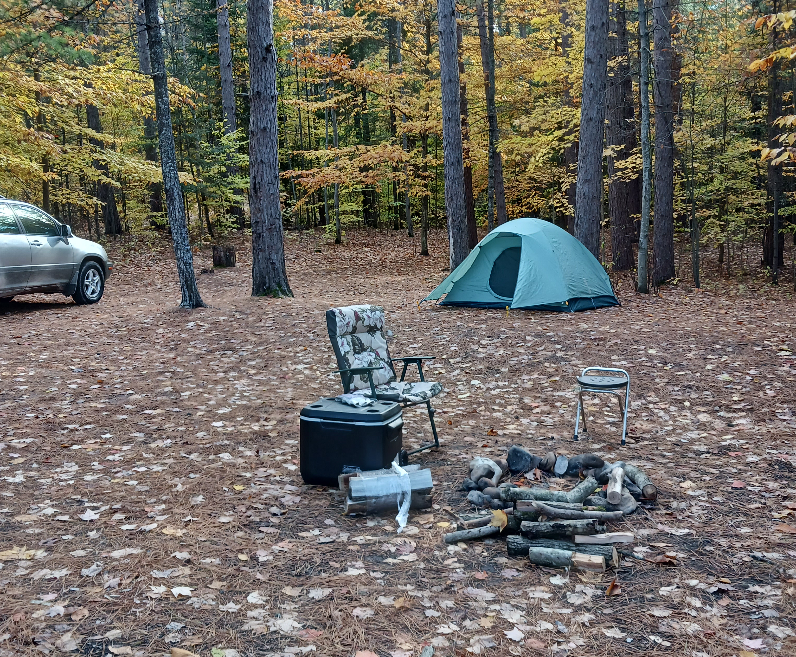 I met Natch, Jake and Feral at a favorite remote camp spot, burnt clutch camp, which is near the Pigeon River and Grass Lake on Ford lake Road. I arrived on Friday afternoon and expected Natch around 9:00 PM so I had a fair amount of time alone. I pitched my backpack tent and readied the fire for later then went for a long walk on a trail that leads to the river. I hooked a Carhart beer holder to my belt and also a hunting knife on the extremely remote chance I might come upon a bear. I wrote a paper in college about bear attacks in national parks and the stories stayed with me. Most of the really gruesome stories involved grizzly bears, not the black bears found in Michigan, but I figure if it ever happens I’d rather have a knife on me. The reason I was even thinking about bears is a story told to me by my doctor, whom I had just had an appointment. She knows I camp and mentioned how a grizzly approached her and her sisters out west. On the same trip she was standing on an outcrop of rock, looked up, and saw a mountain lion staring at her. I have a very fun, interesting doctor. With camping experience!