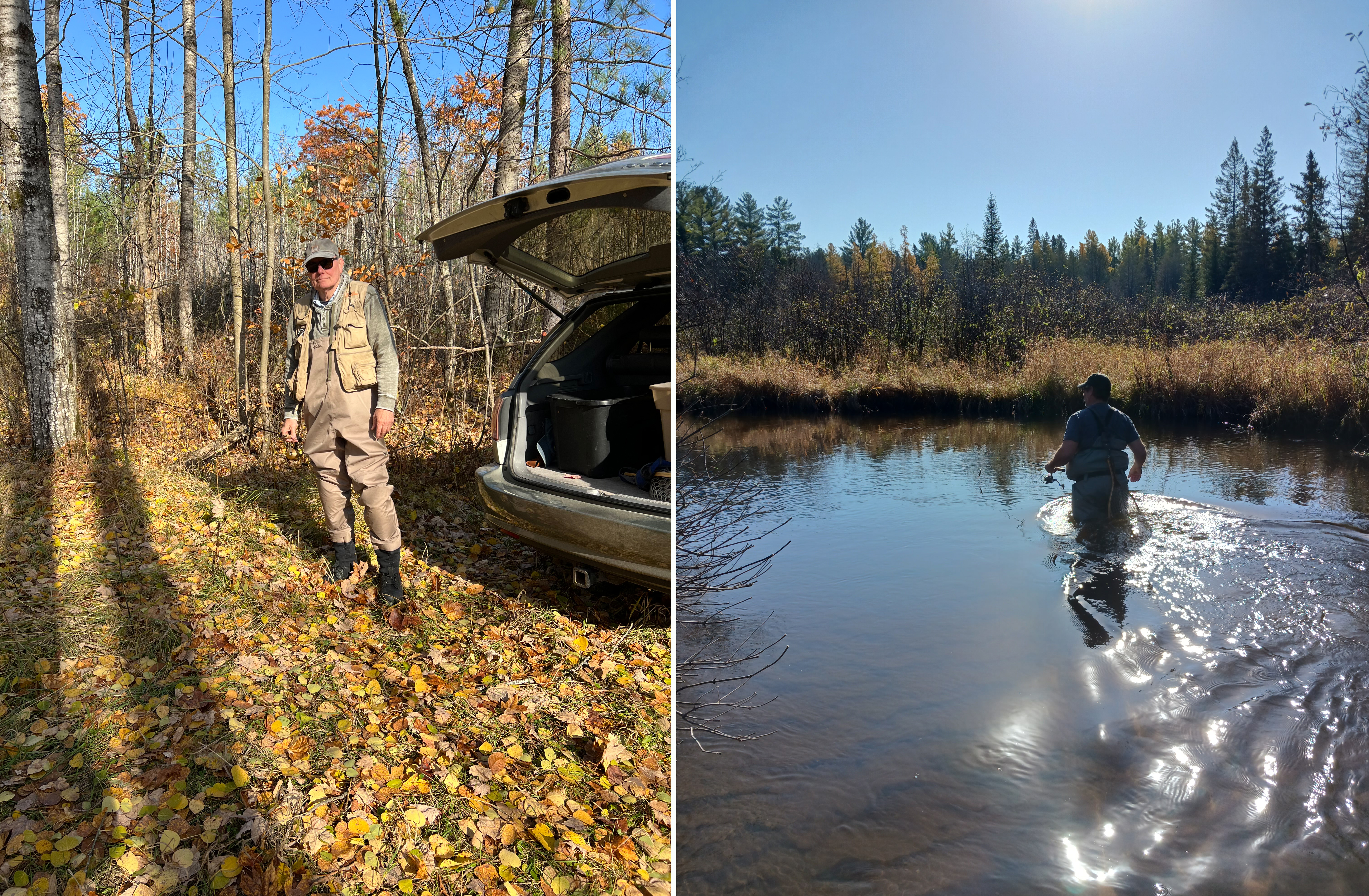 We dropped thirty bucks plus tips on an “okay” breakfast so my earlier story of making breakfast in my trailer to save money reverberated. We headed to the river about 10:00 am and left a note for Feral and Jake to know when to expect us. The temperature was in the mid-sixties and warming up. The Pigeon River stays open past the normal close of trout season but you can only keep rainbow trout. Last year, same time, Natch caught a twenty inch rainbow. So it can happen. We didn’t catch anything but we would not have traded that slow wade up the river for anything. The colors along the stream were spectacular. We had no cares or expectations of another rainbow trout. It just felt great to be up north.