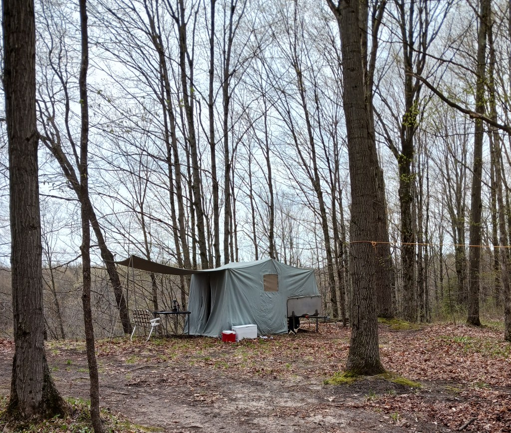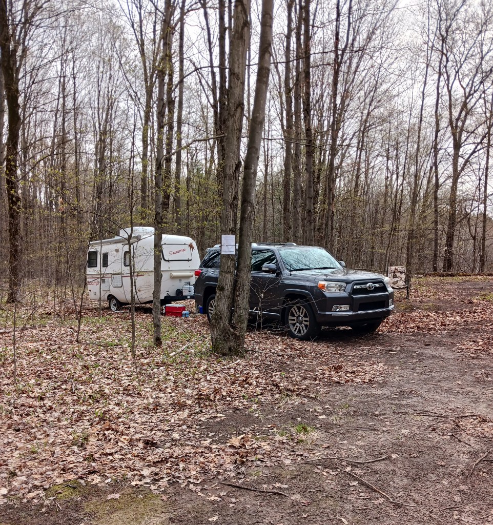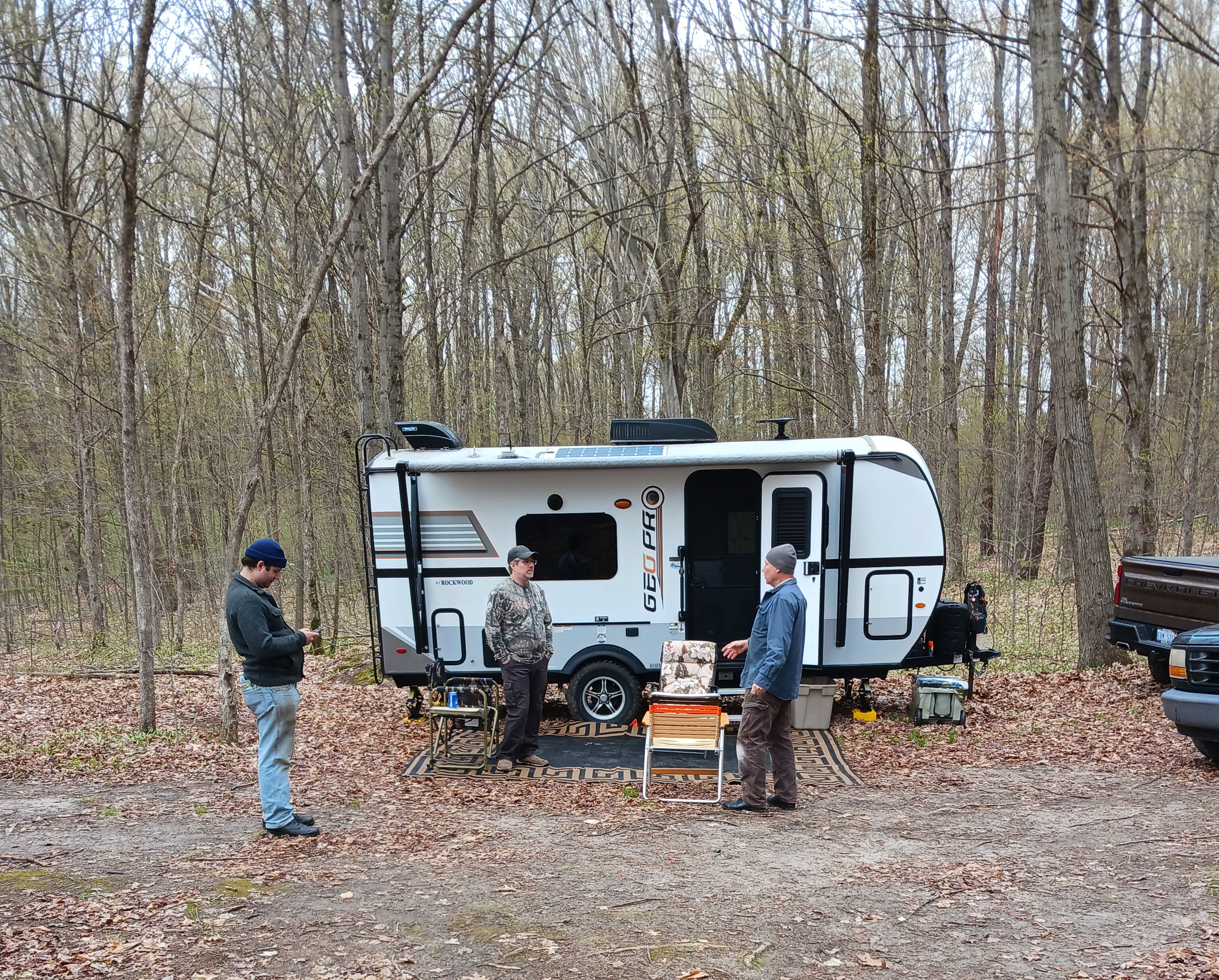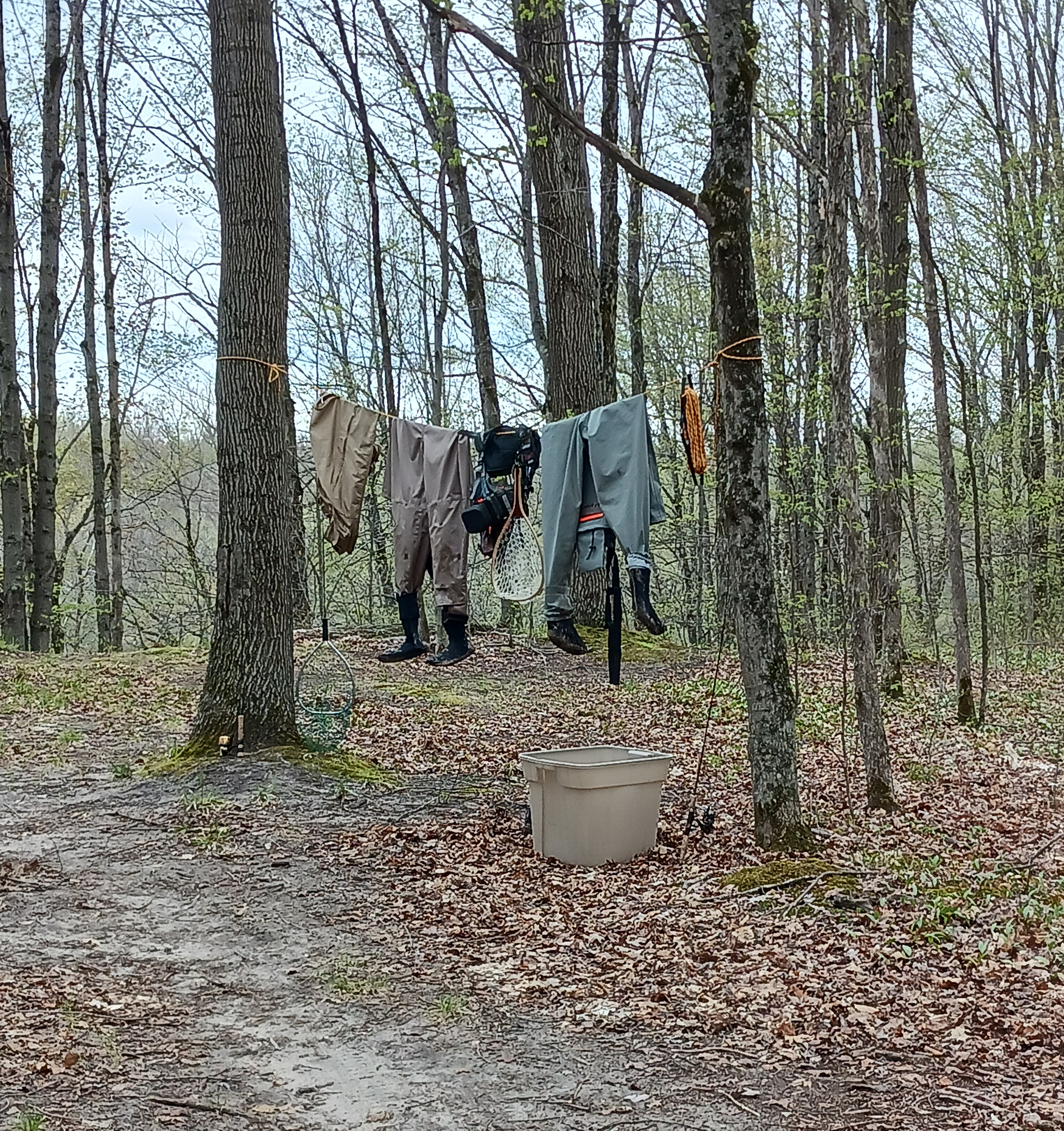 We centered our trout camp on the first weekend of May which worked out well. We had the Pine River to ourselves. Jake, Feral, Natch and I met up at our remote spot on Thursday. Natch brought his new trailer, the first use for him, and he had set-up figured out like an old pro. It’s pretty large (compared to my Scamp) and has lots of new technology including solar panels, a TV with antenna, wireless booster, hide-a-bed, full bath, etc, things to sell a wife on it but not practical for the low tech camping experience we typically enjoy. We generally don’t spend time in campers – it’s all fishing and campfires. Except for breakfast which I took over when I bought the Scamp. I should mention Natch went from a 1964 Apache tent camper last year, a slightly new camper than Jake’s, to this. Natch is a technology wiz so in a sense this makes perfect sense. His tent camper went to one of his boys.