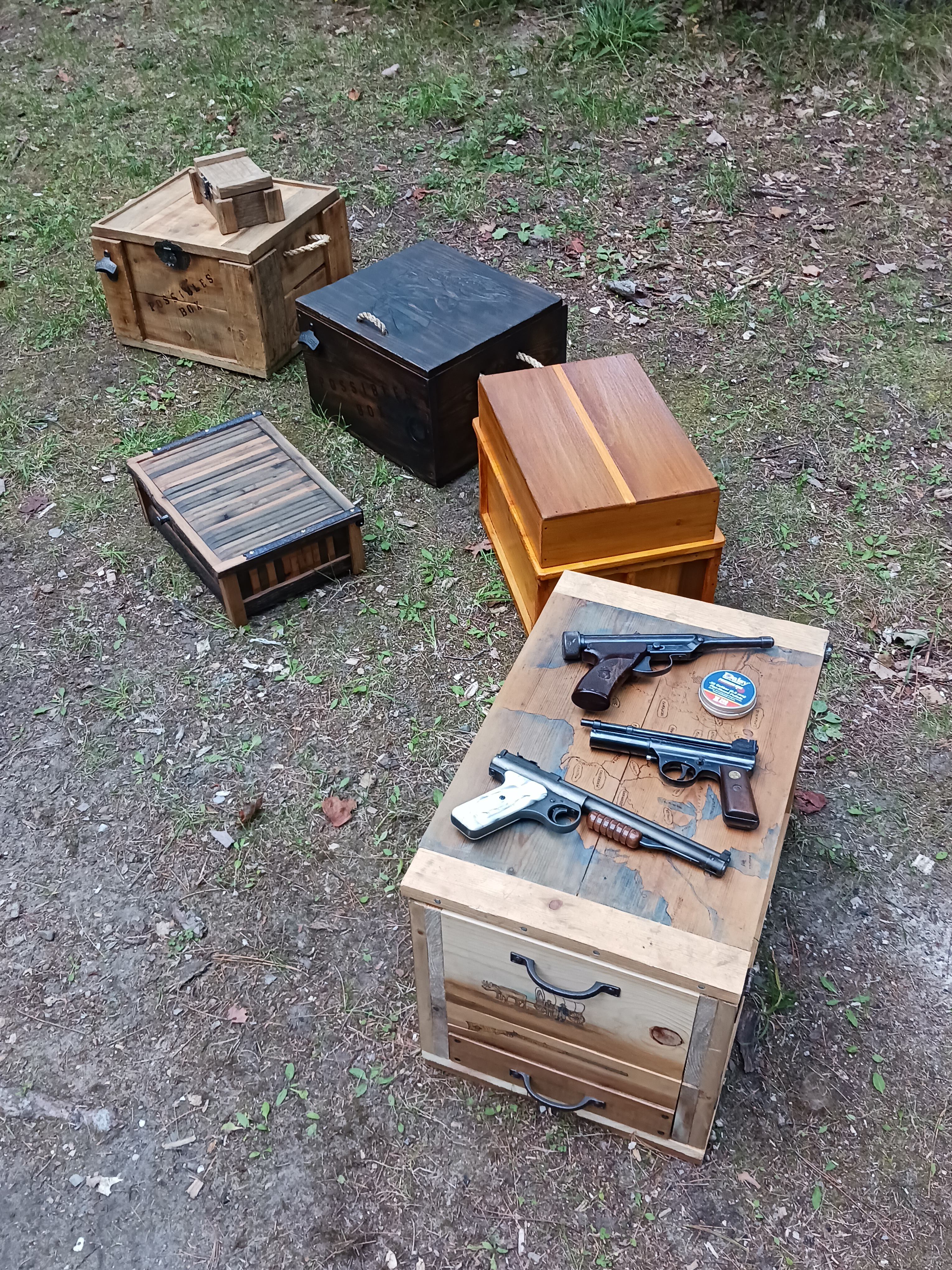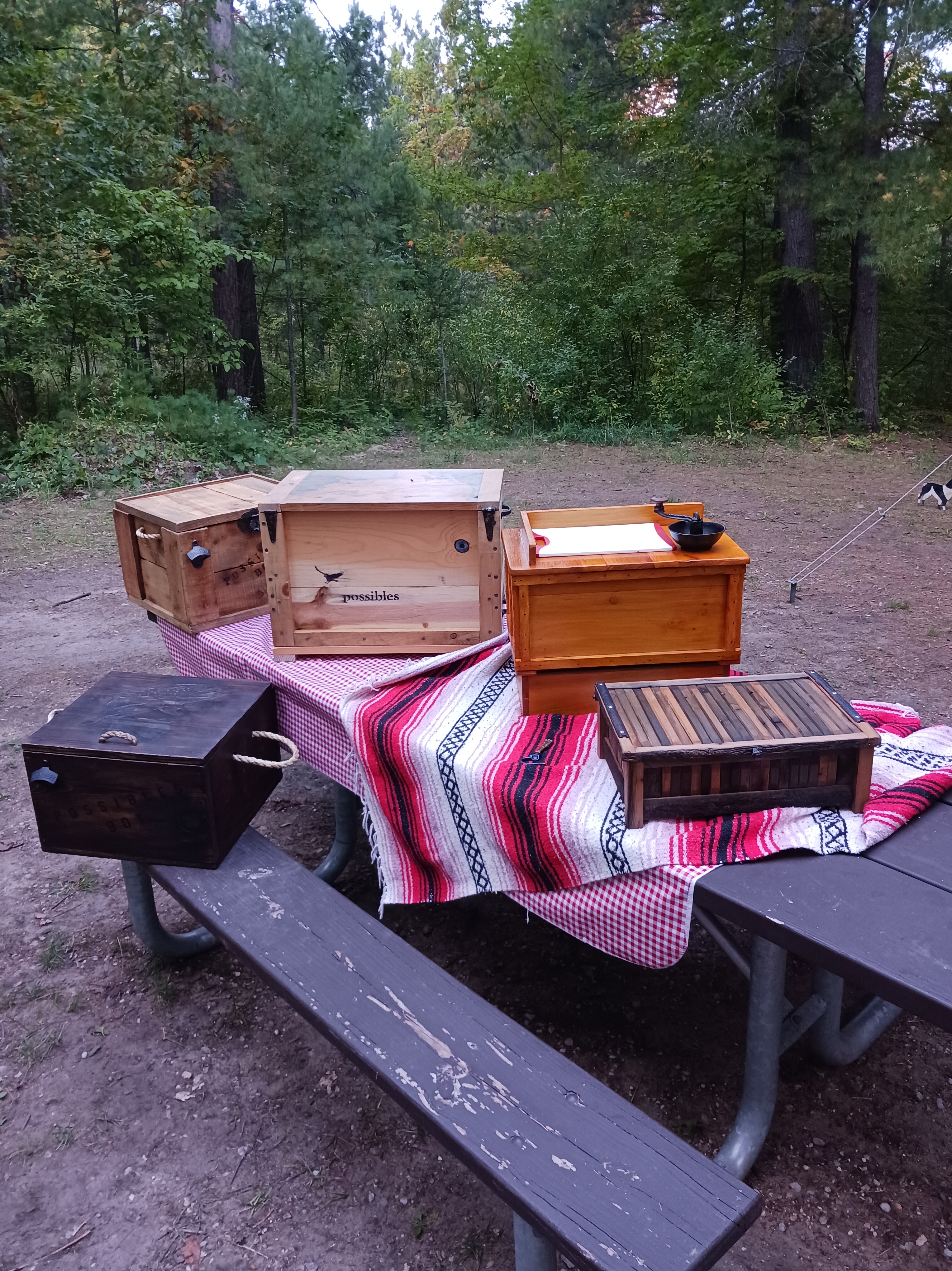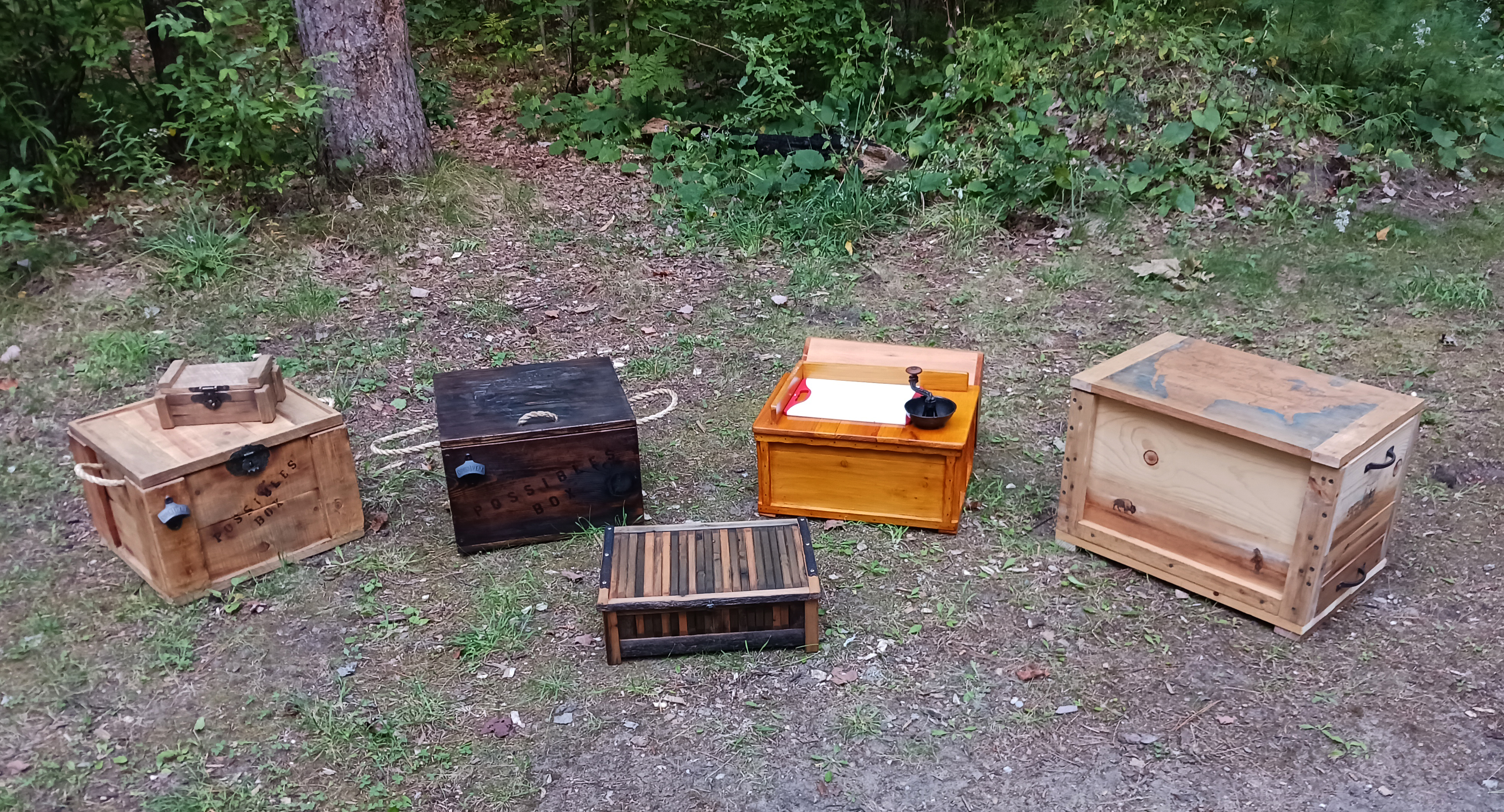 From left to right: Natch made two boxes, the first entirely from a wood crate. It has a custom latch and a smaller box with a matching latch. The rope handles are a nice touch and the workmanship was stellar. He also made the darker box alongside which features a custom trout engraved on the top and a magnetic latch. I like how the front has a lighter scrubbed area with the words possibles box. Each box includes a bottle opener. Nice work Natch!