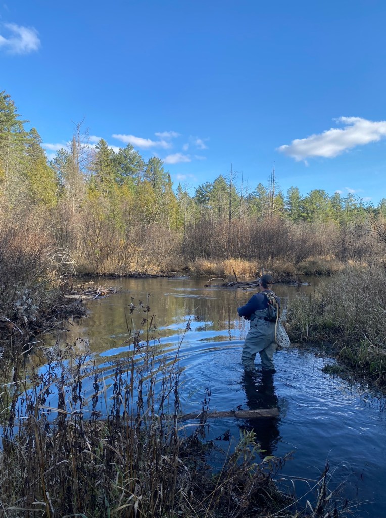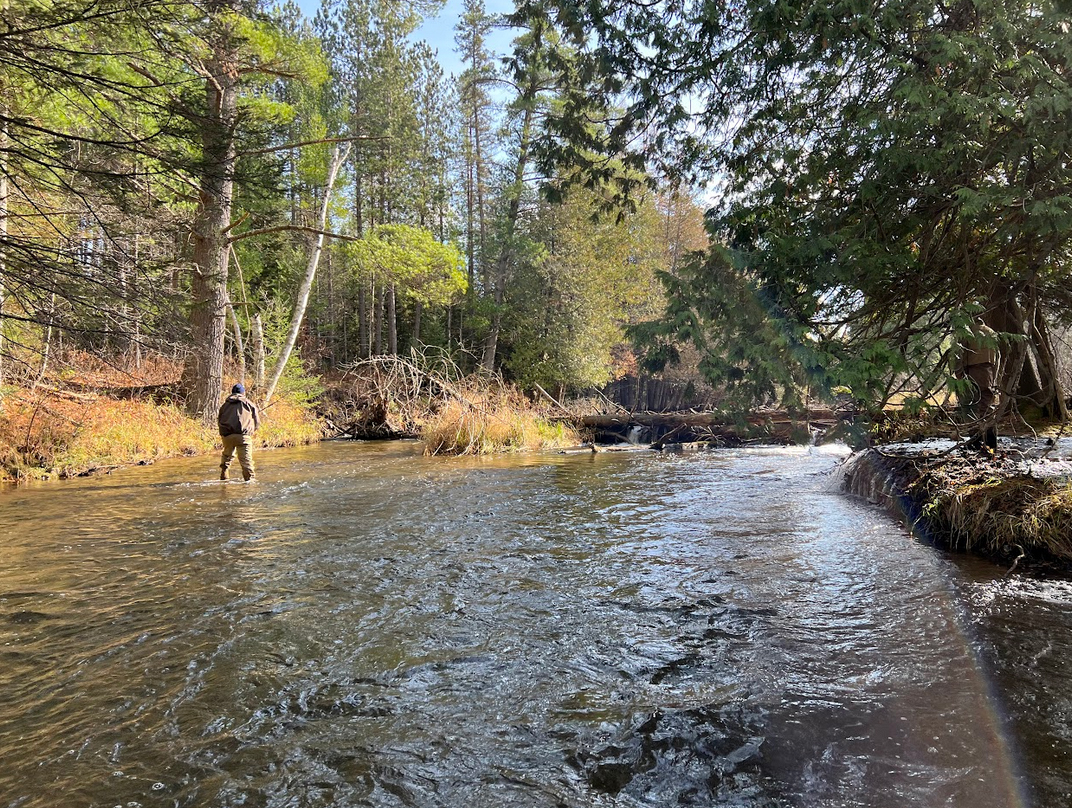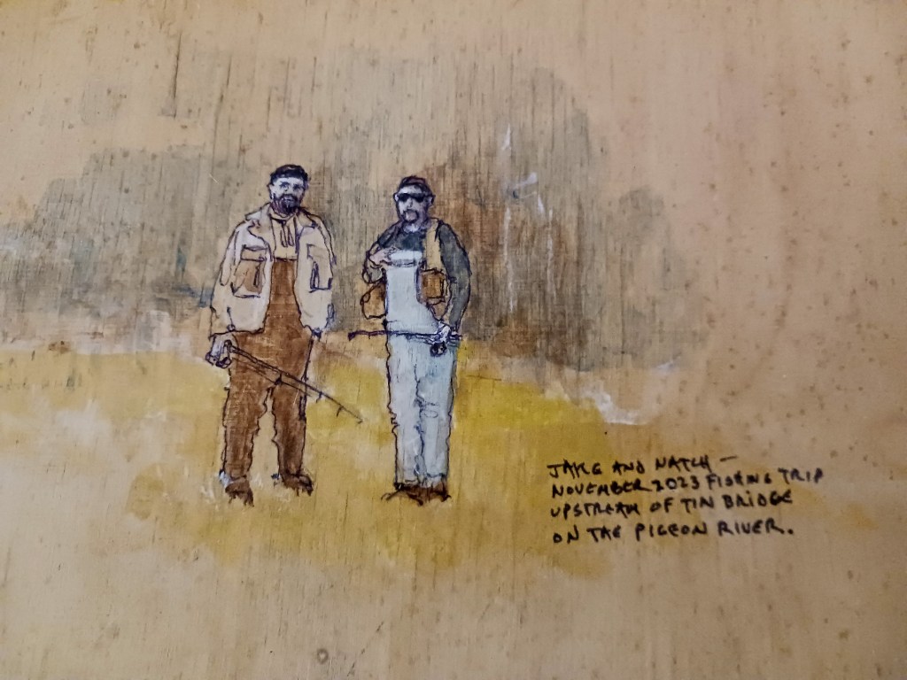 We fished the Pigeon River. Two spots. Last fall Natch and I found new access upstream of Tin Bridge. There’s a locked DNR gate on the main two-track so we parked there and walked in. It opens to a huge field and a footpath leads through it and down through woods to the river. The Pigeon is mostly sand in that stretch, hardly any gravel – which was surprising. A half mile or so upstream it turns to mostly gravel, and then back to mostly sand. Fishing was tough. Natch saw a nice rainbow trout over twenty, and Jake saw a smaller brown trout. We didn’t fish long because there wasn’t much trout cover.