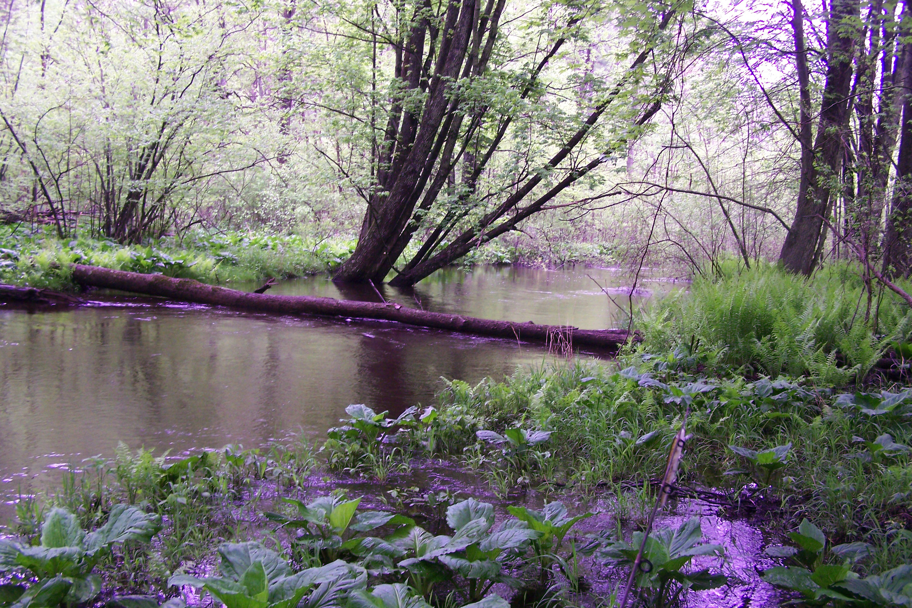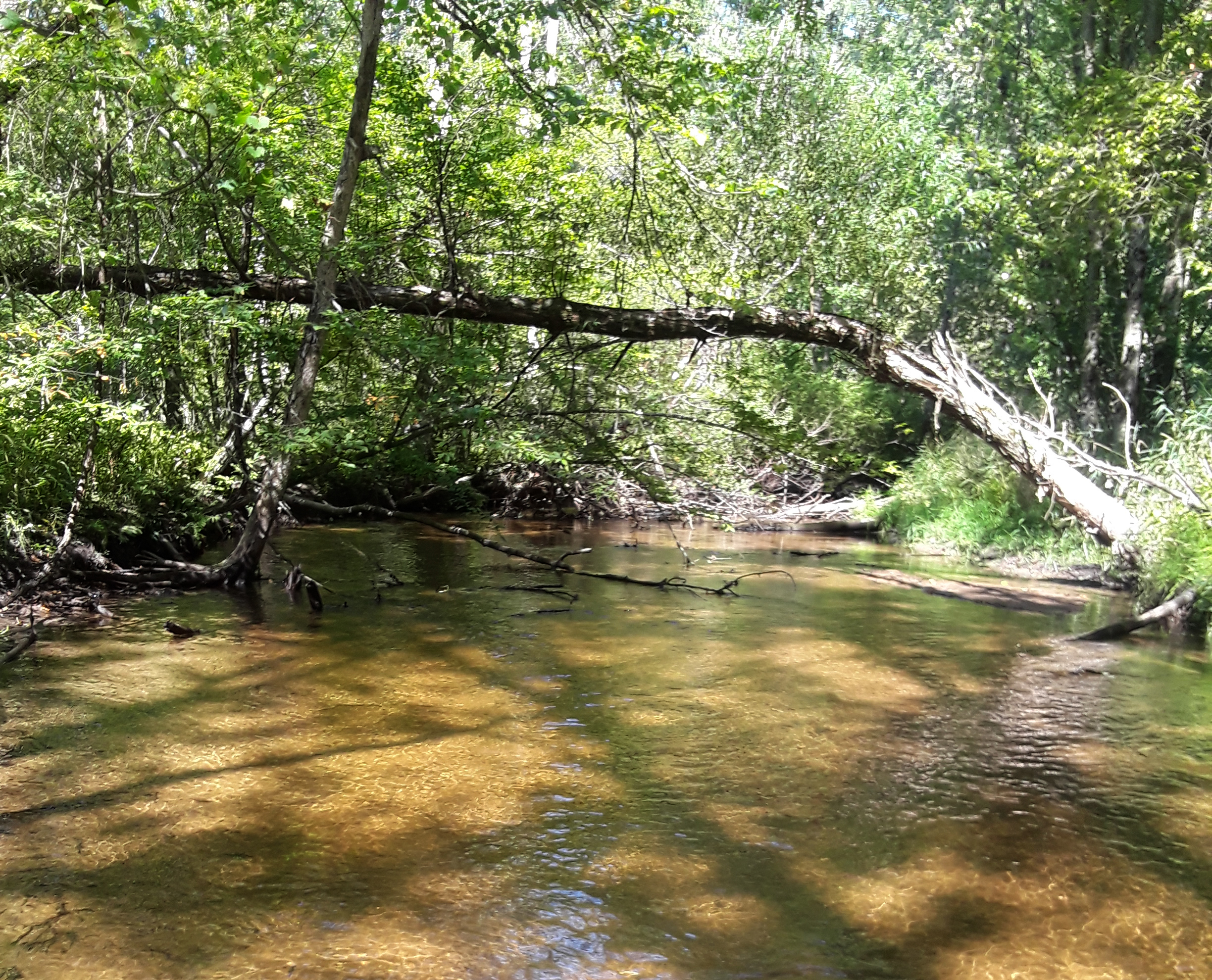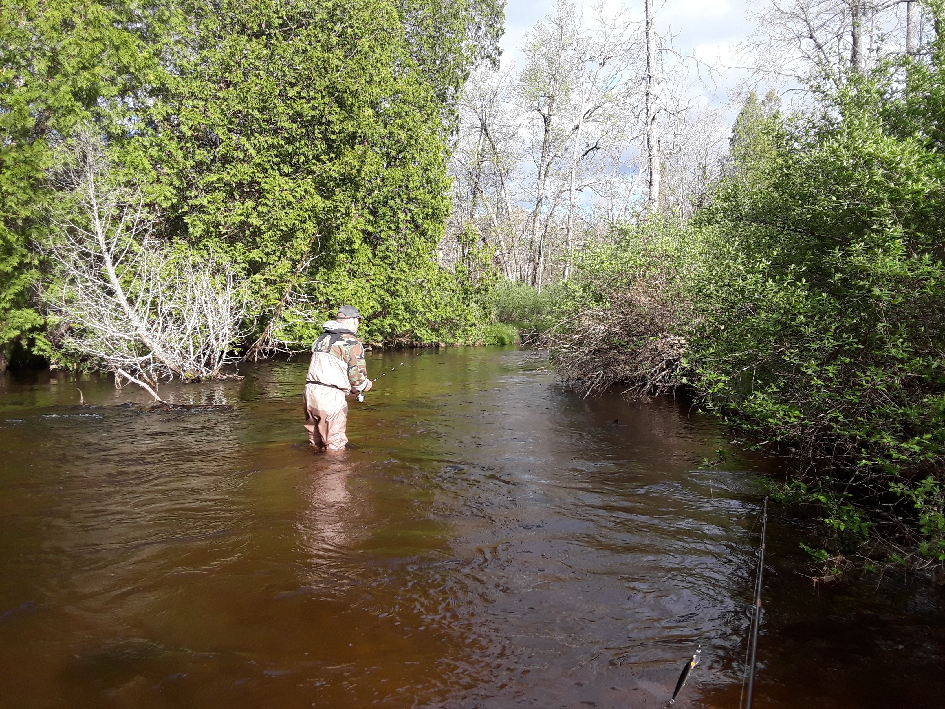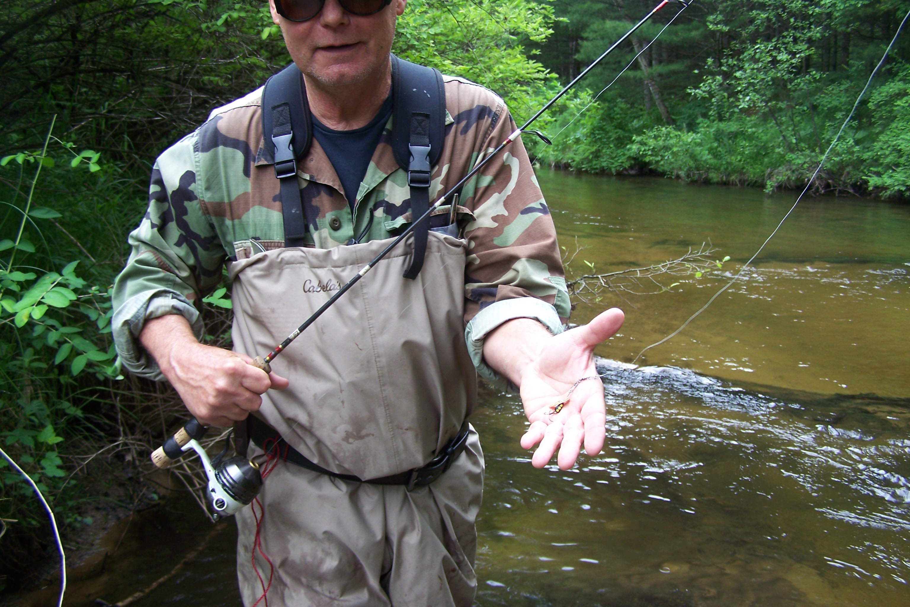 I called up Feral this week ( early August) to see if he wanted to go trout fishing and mentioned keeping a couple for dinner. He groaned when he heard that. That’s a sure way to jinx a trout trip. But he was game so we headed up to the Pine on an overcast morning. Feral had left all of his trout lures up at his second home so when we reached the river I opened my two small totes of lures and told him to pick out whatever he liked. He picked an old standby that I had used earlier this year and did well with, a small floating minnow. I picked a similar but larger lure and we fished for about an hour with Feral catching one keeper. The fishing was slow and the wading tough so I opted to head back to the car for a break and to rethink the fishing. We decided to try another stream and when we arrived there we had a beer and sandwich on a high bluff overlooking the stream. We took a path downstream and got in at a bend and right away Feral started catching trout. He was placing the lure into tight spots up under overhangs and dropping it right next to the bank. I can’t remember him casting so darn good and the lure could have been made for that stream because his precision casts were rewarded again and again. It was so fun watching that I was content to follow, though I did take the lead here and there. My larger lure had a couple follows but nowhere near the constant action of Feral’s smaller floating minnow.