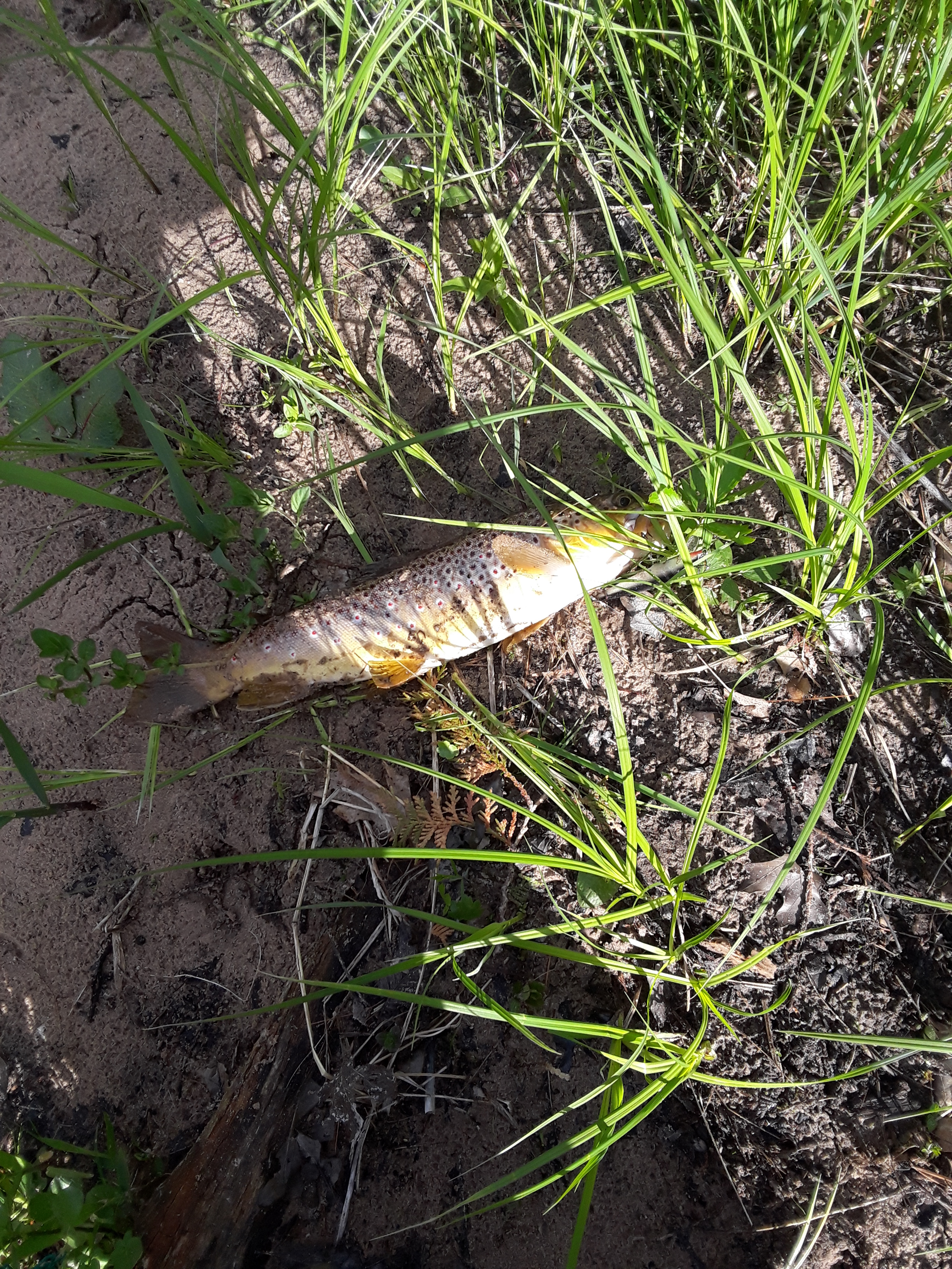 So this is where it gets interesting. We had enough trout for our dinners. Feral was dragging a good stringer which divided nicely. Then he caught a trout about sixteen inches and standing there watching him hold the trout I asked if he was going to release that one.. we had plenty. The gears were grinding and finally he said he was going to keep it. There was no reason he couldn’t. He could always keep it for a second meal or freeze it. But in my mind it was one fish too many. He cleaned the fish and added it to the stringer. I took the lead but we were both thinking we would call it quits soon and there was a logical get out spot up around a bend or two. We came to an interesting piece of trout cover on our left that was divided into three separate castable areas and I managed to see a flash in the first area but didn’t catch him. I moved up to the second castable spot and Feral moved up to the first. From my vantage point I could see down into the water where he was casting. Suddenly he had a fish on and it broke off the lure, the lure that was responsible for catching our dinners. He apologized for losing the lure but frankly I was going to give it too him anyway, for providing the entertainment and dinner. No problem. I gave him a second lure and he made the same cast with me looking right down into the water where he cast. I saw a flash which in my mind was a rainbow trout, silvery and more rounded shape than the brown trout we were catching. Feral made the exact same cast and this time the fish was on but did managed to get off. Feral said it was a pike. He saw it close up before it threw the lure. No doubt, a pike. That of course would explain how the first lure was lost. Pike have sharp teeth known for cutting fishing line. The pike never felt the hooks on the first lure and cut the line. So he was not shy about chasing a second lure.