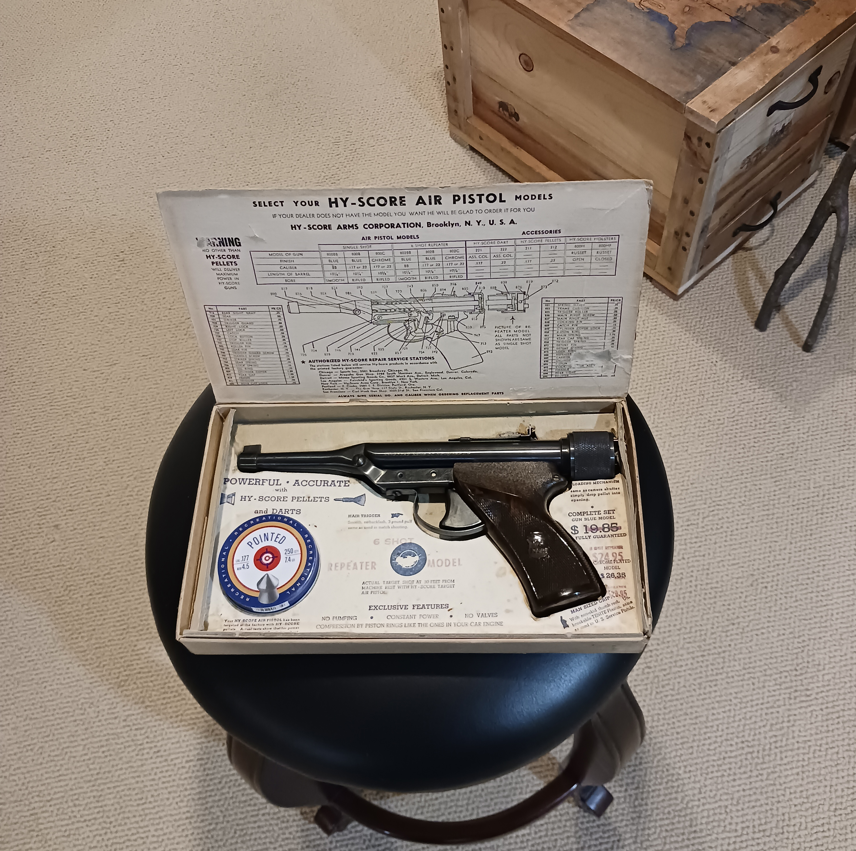 I went to an auction in SW Michigan and found a vintage American-made pellet pistol and won the bid. It’s a Hy-Score model 802B in .177 caliber. It shoots pellets the size of BBs. It came with the original box, or what was left of the box, which adds more collector value. I re-glued the box and hinged the lid, so it looks good and holds the pistol. Online these sell for $200 and up, mostly up, so my $40 win was a shock. It was the first time I had bid at a live auction so it was exciting and nerve-racking, not helped by my bad hearing. I kept waving my auction number every time the auctioneer said a new number and he finally said, “I have your bid.” Suddenly it stopped and I won. There were actually three pistols in the bid, with the high bid picking their choice of the three. I took the Hy-Score. The other pistols were not vintage, possibly CO2.