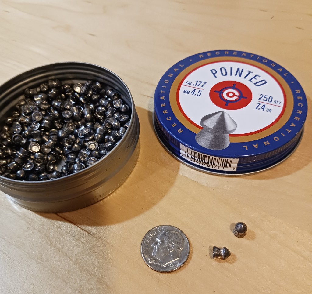 So why are these pistols cool? It’s the air. How do you compress enough air to send a tiny projectile out of a muzzle at 300+ foot per second? The engineering is spectacular, and it has been going on for a hundred years. There is so much to learn and so much fun information online, in particular, youtube videos showing the vast array of makers and models, how to repair them, and side-by-side shooting comparisons. Here’s a closeup of the pellets.