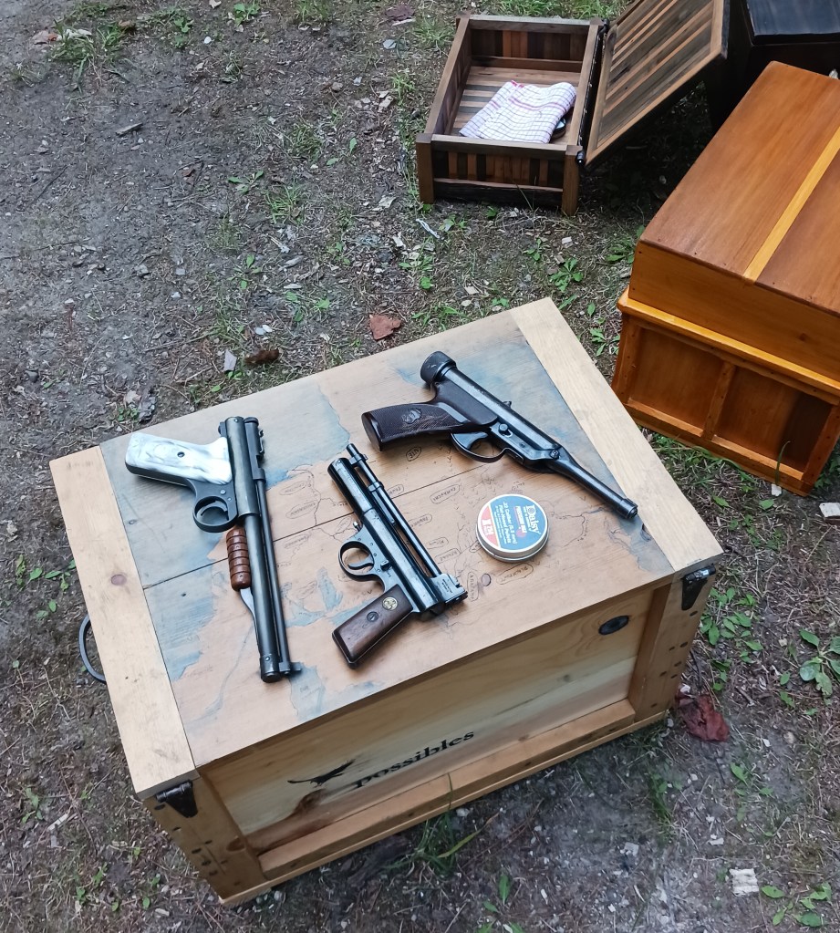 Here’s a photo of the Benjamin (with the white grips). Also Feral’s Hy-Score model 800 in .22 caliber, and Jake’s pre-WW2 Webly. This photo was taken last fall at trout camp. The wood boxes are part of the “possibles box” challenge. See the earlier post for details.