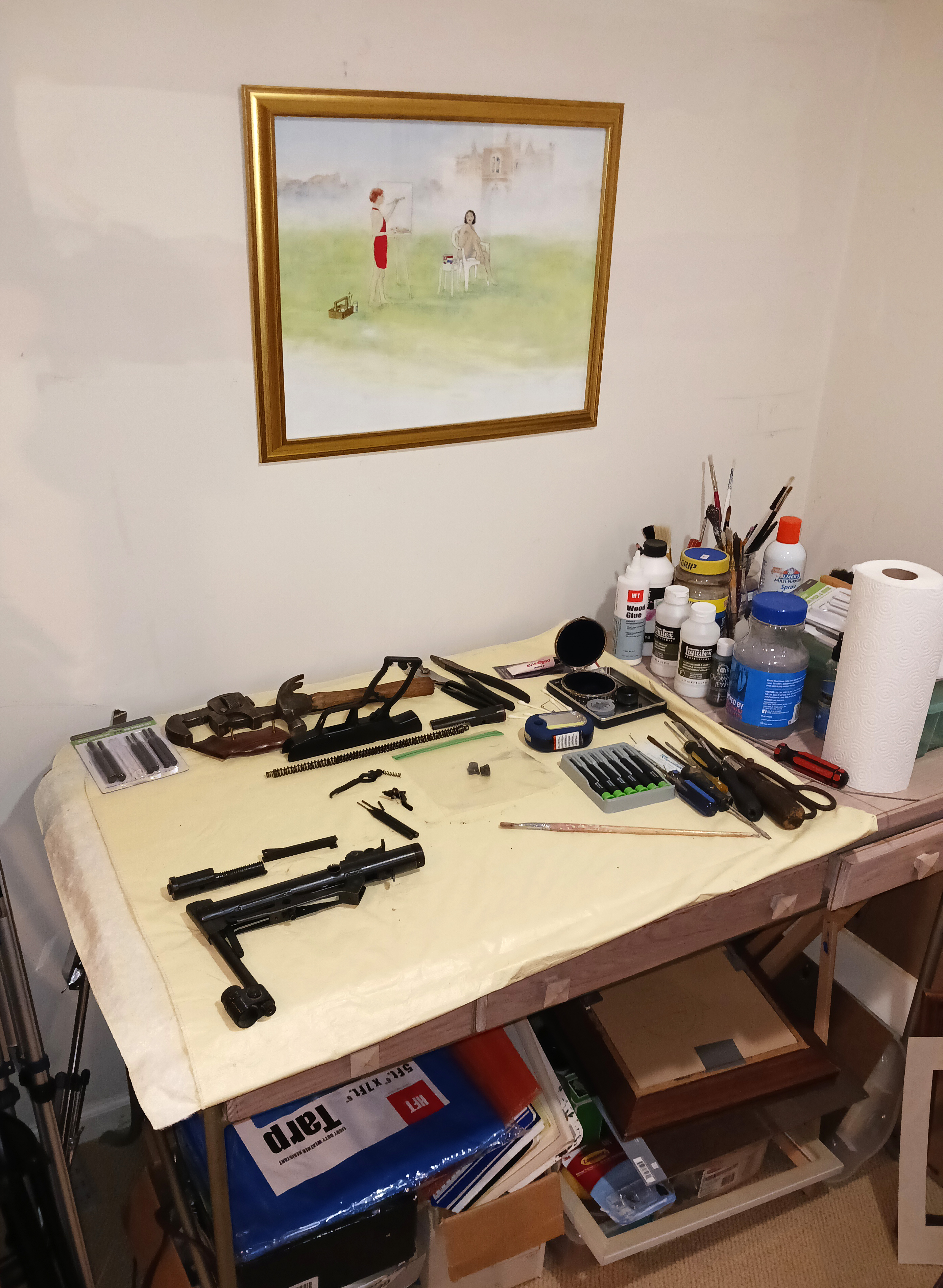 So that is the pistol, in pieces, on the tabletop in the main photo. I stripped it down far enough to get the pistons out. The rear one looked good, the seal on the front piston had disintegrated. New seals are on their way from Air Rifle Headquarters (.com). I found some pretty good instructions online but the real test is reassembly. How to get the pistons, springs, and pinion gears back into the cylinder. I’ll post a photo after I get it back together and have it working.