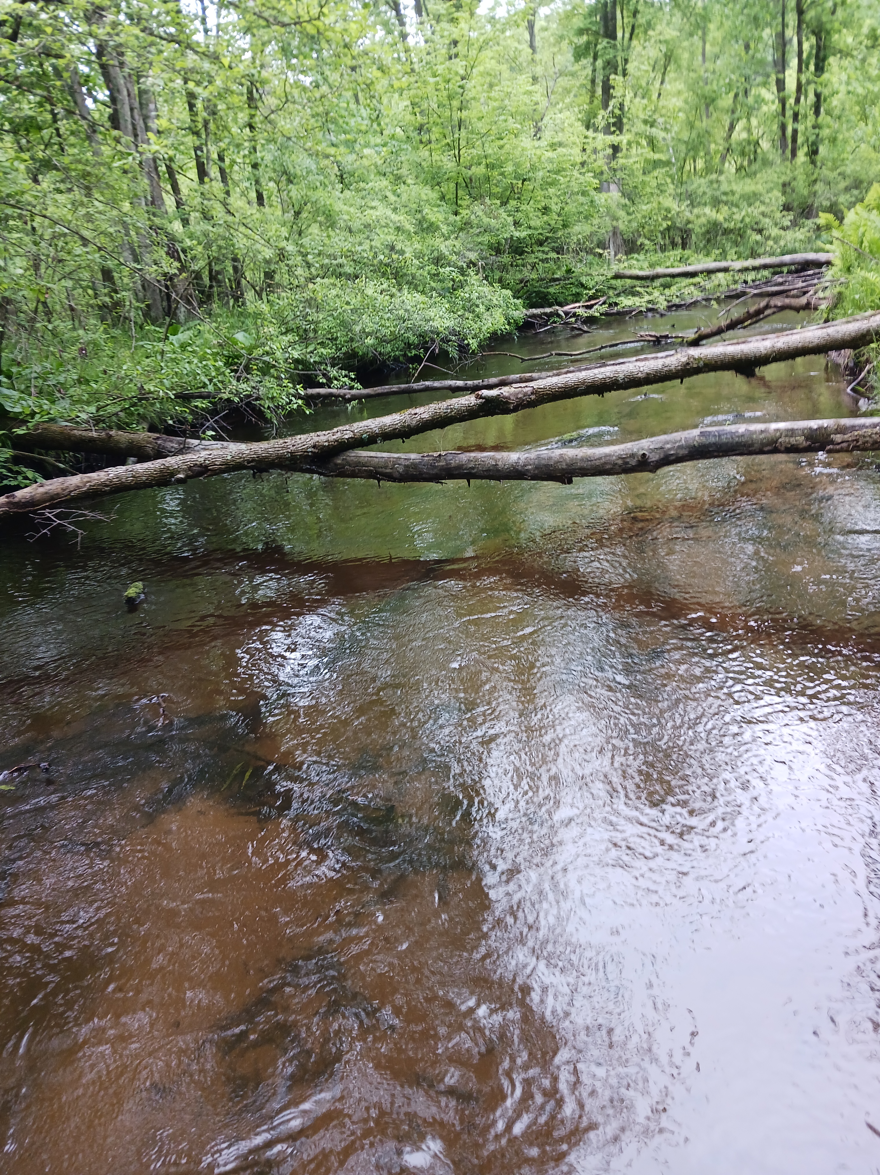 We fished a stretch of the Pigeon that’s upstream of Tin Bridge. We expected lots of gravel bottom and shallow water and didn’t know what to expect for good bends or deep holes. We hadn’t fished the stretch before. It wasn’t long before we came to the beaver dam we discovered last fall (and I reported to the DNR). The elevation drop is just high enough to keep some migrating/spawning browns and rainbows from getting upstream (my opinion). The DNR guy I spoke with said he would contact some trappers about the beavers because if they open the dam the beavers would just block it up again. Doesn’t look like much has changed in the last ten months. The Pigeon River needs some help after the Song of the Morning fiasco.
