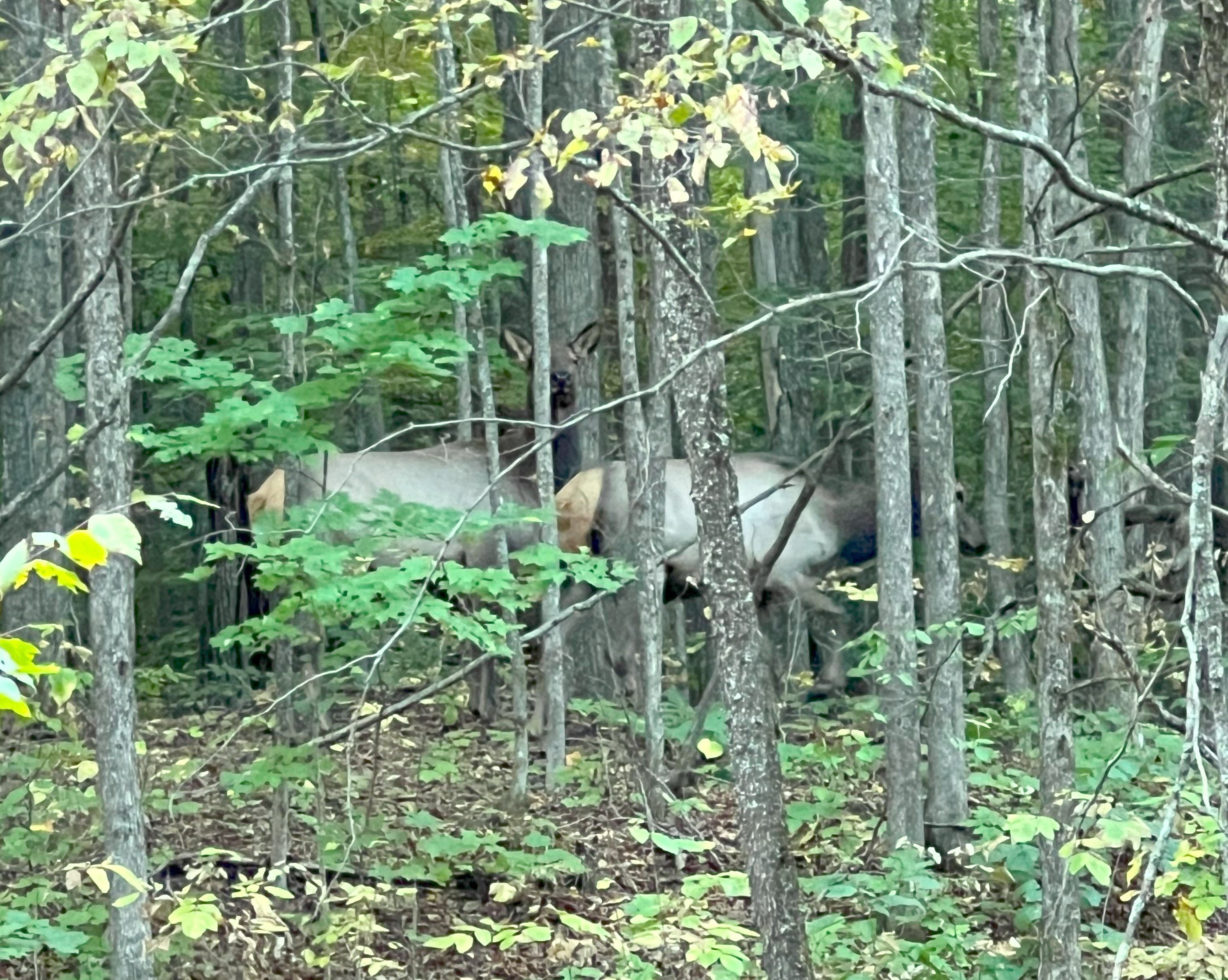 One morning, on the way to a fishing spot, I had an owl swoop in front of my car and land in a nearby tree. I pointed my phone camera out the windshield and caught that one. Later one swooped through camp right next to me and landed on tree over the ridge in camp. Natch took a photo but it’s hard to see in the branches. The strange thing was it happened when Natch and I were commenting on the songbirds making such a loud din it seemed unnatural.