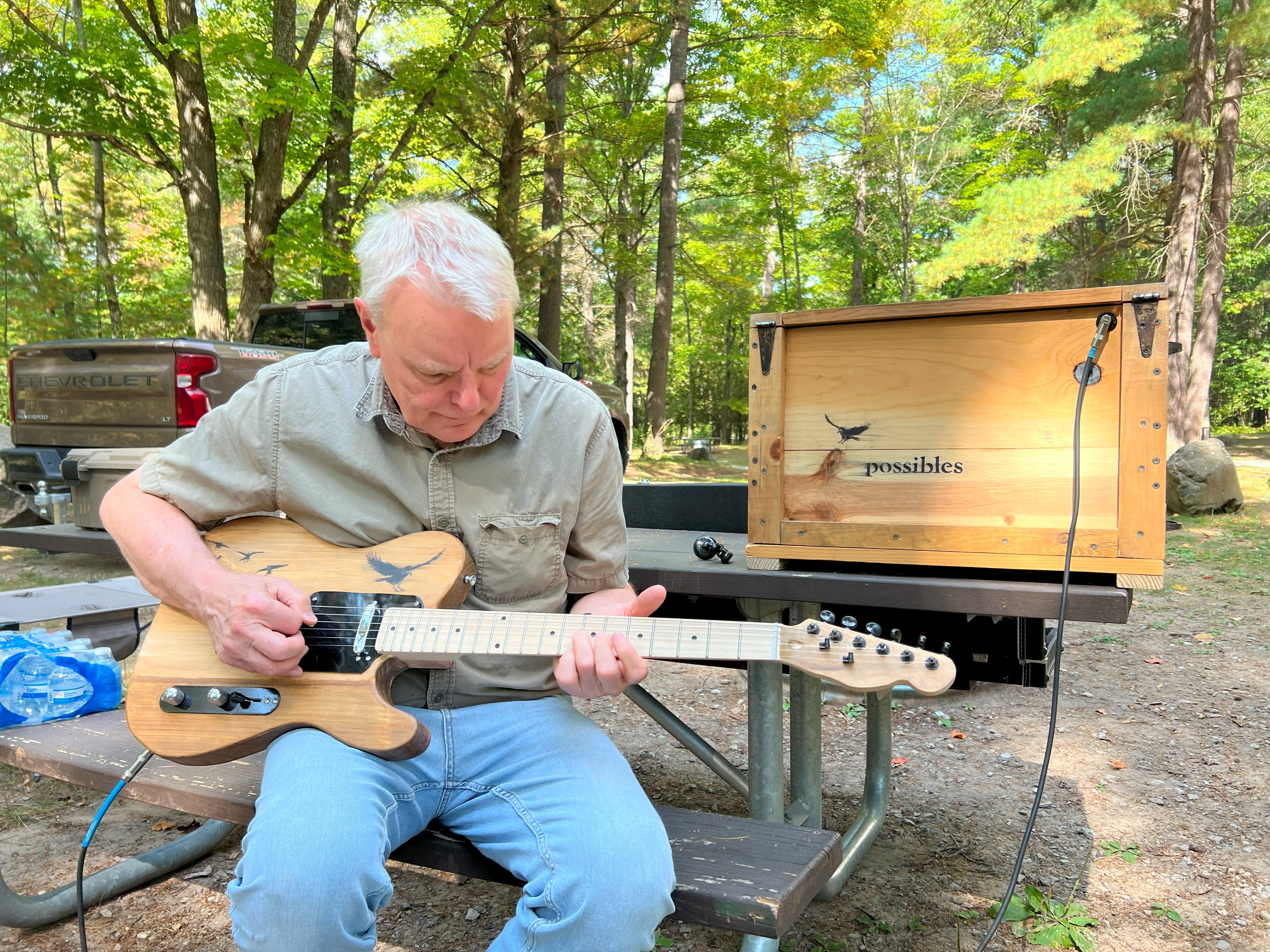 I brought my maple-bodied Ventura camp guitar and also a new/used Cajon box drum I found on marketplace. I thought it might add some steady bass rhythm. Feral played that. I am thinking about doing some Dune movie illustrations on the Cajon – call it the Dune thumper.