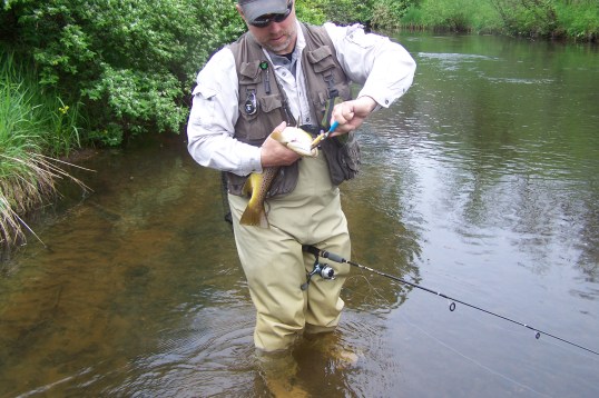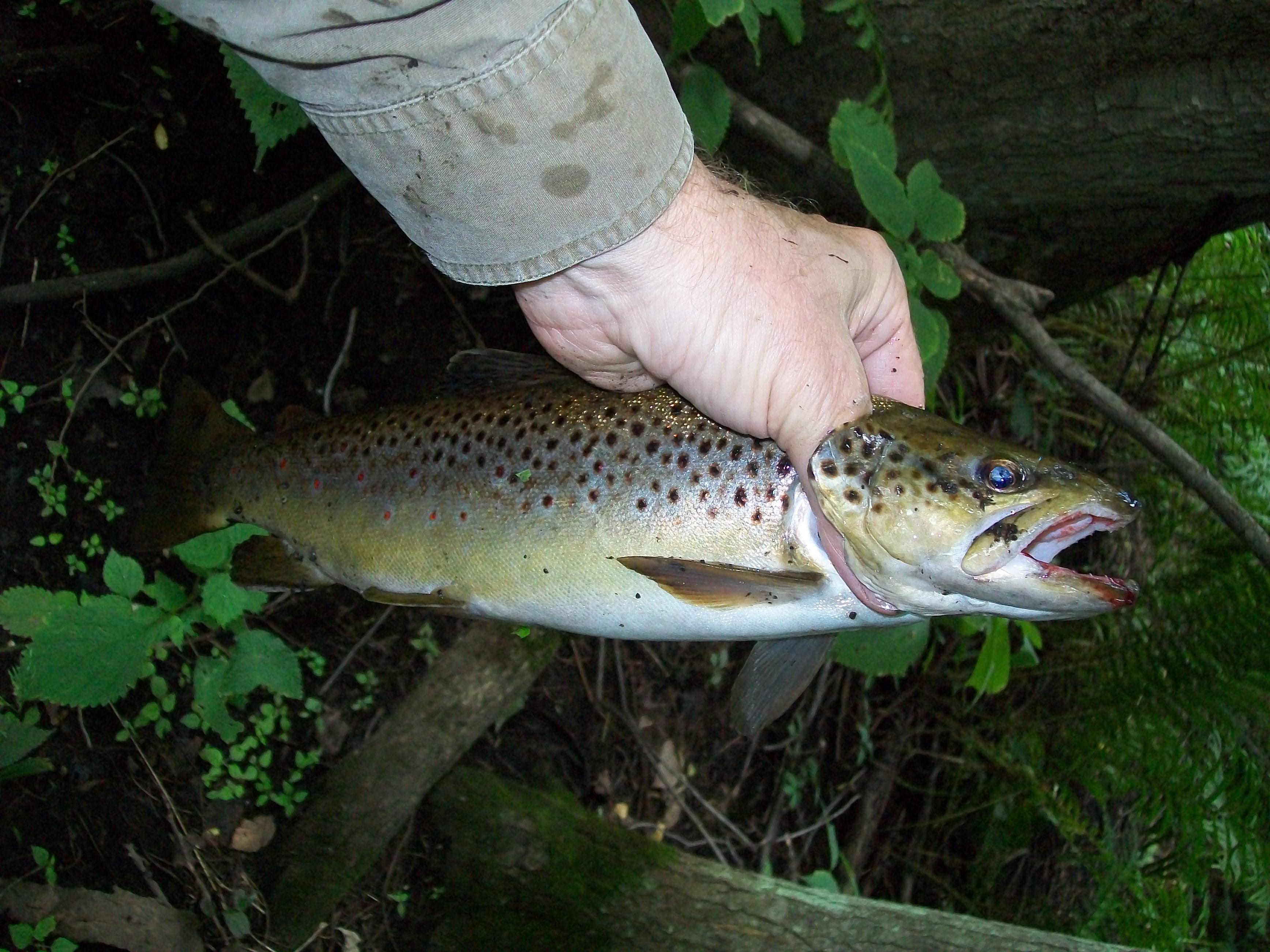 We hadn’t fished but one or two bends before Natch hooked up with another decent fish. It came from under a grassy bank. From then on I was determined to catch something over 21 but it never happened. I did catch a nice rainbow, about 16 inches. It was surprising because brown trout seem to take over and dominate streams. I should mention while Natch and I fished Tin Bridge, Feral fished the Pigeon where it crosses Sturgeon Valley Road and pulled out a 16 inch brook trout. So there you go, exceptions to the rule.