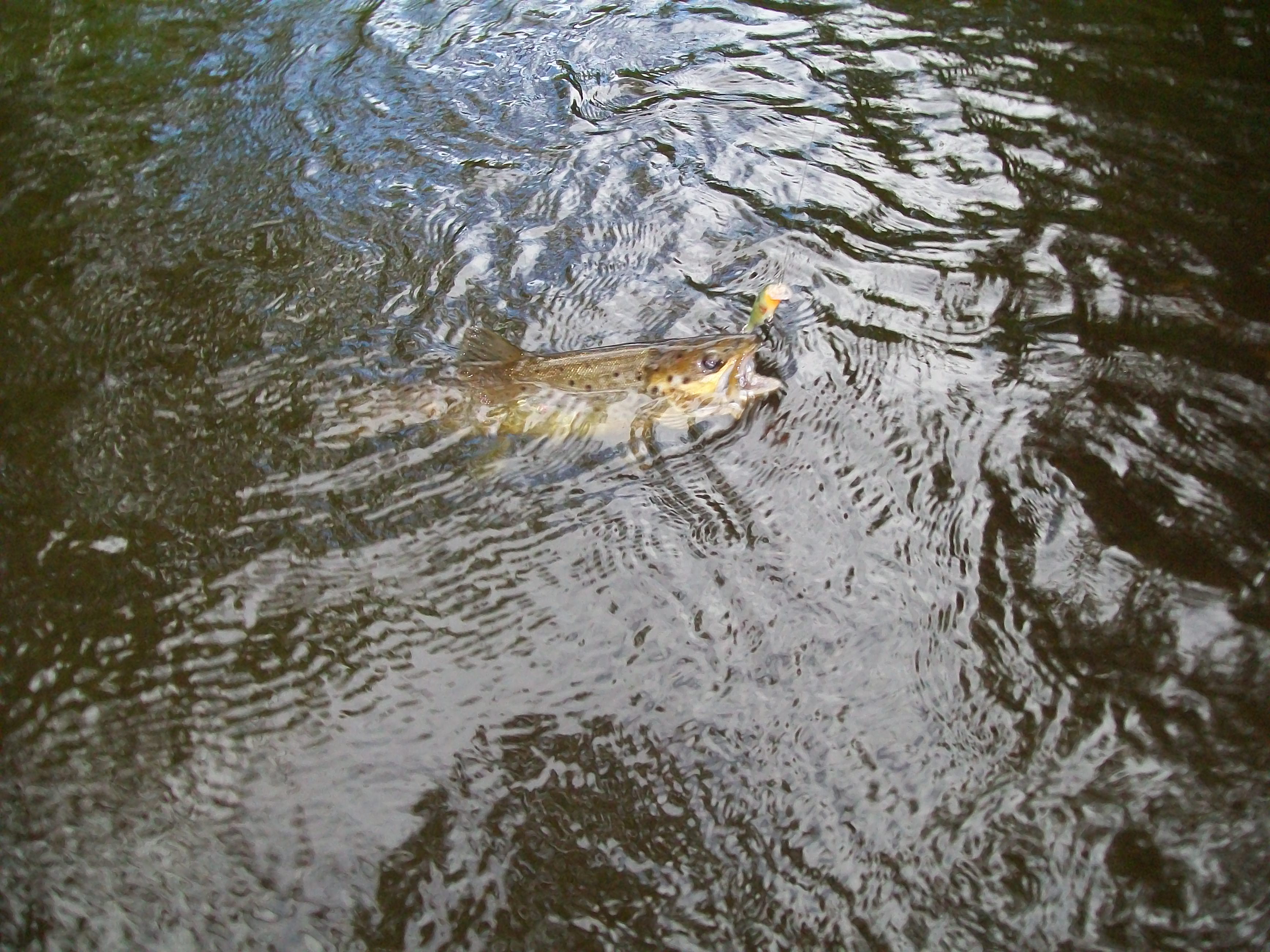 First trip, funny story. Natch and I were on a sandy stretch of the Pigeon and he caught a nice brown about 16 inches. I took the lead and caught one 19 inches. He took the lead and stopped at a pool too deep to wade and told me to make a few cast with my lure figuring maybe a trout might like what I was throwing. So, standing behind me, he made a long cast back downstream to where we had just fished. See the photo above. 21 inch male hook-jawed brown. Now that I think about it, that story isn’t so funny. Two days later I caught another brown about 19 inches on a different stretch of the Pigeon and Natch pulled out another 21 incher. That’s a disturbing trend.